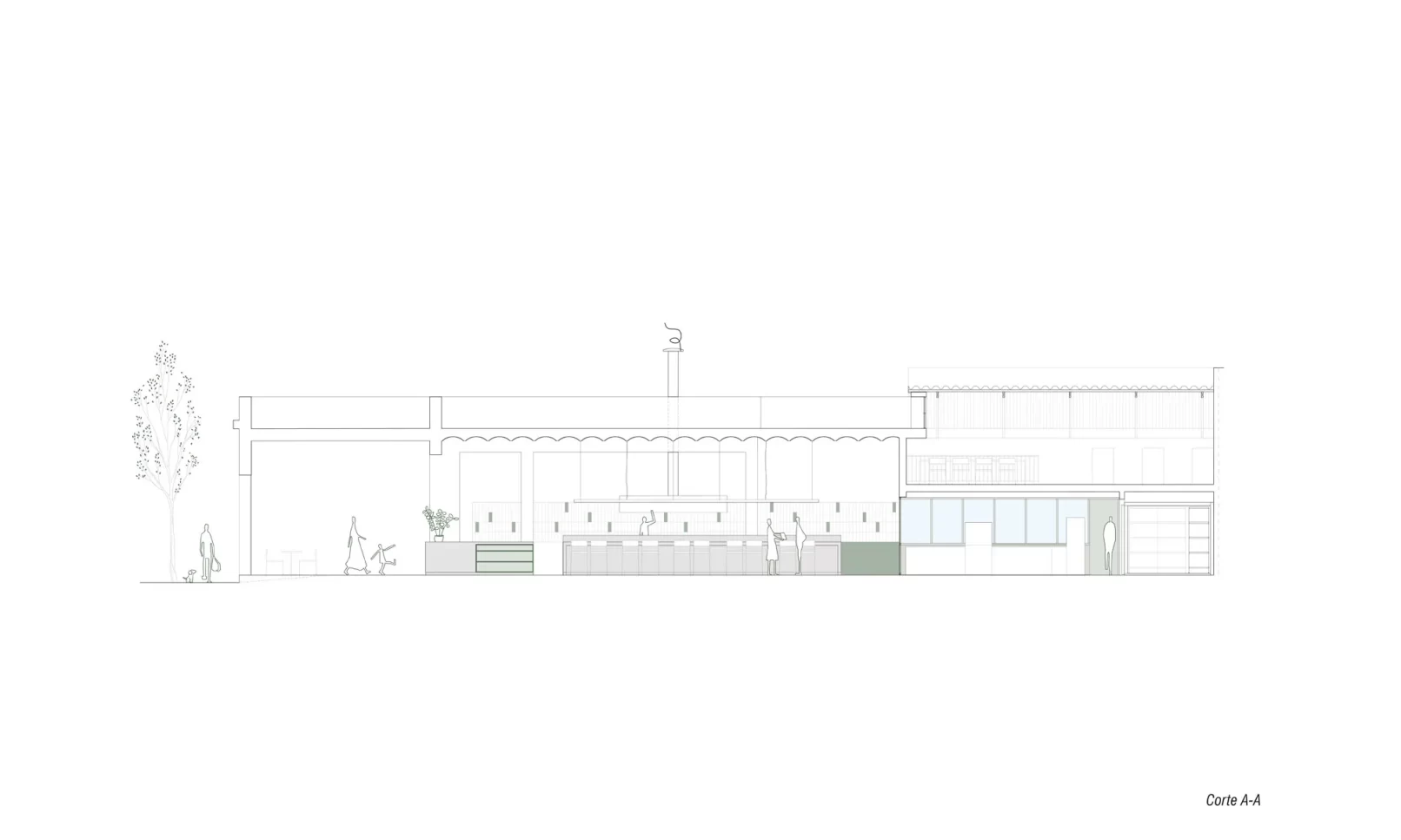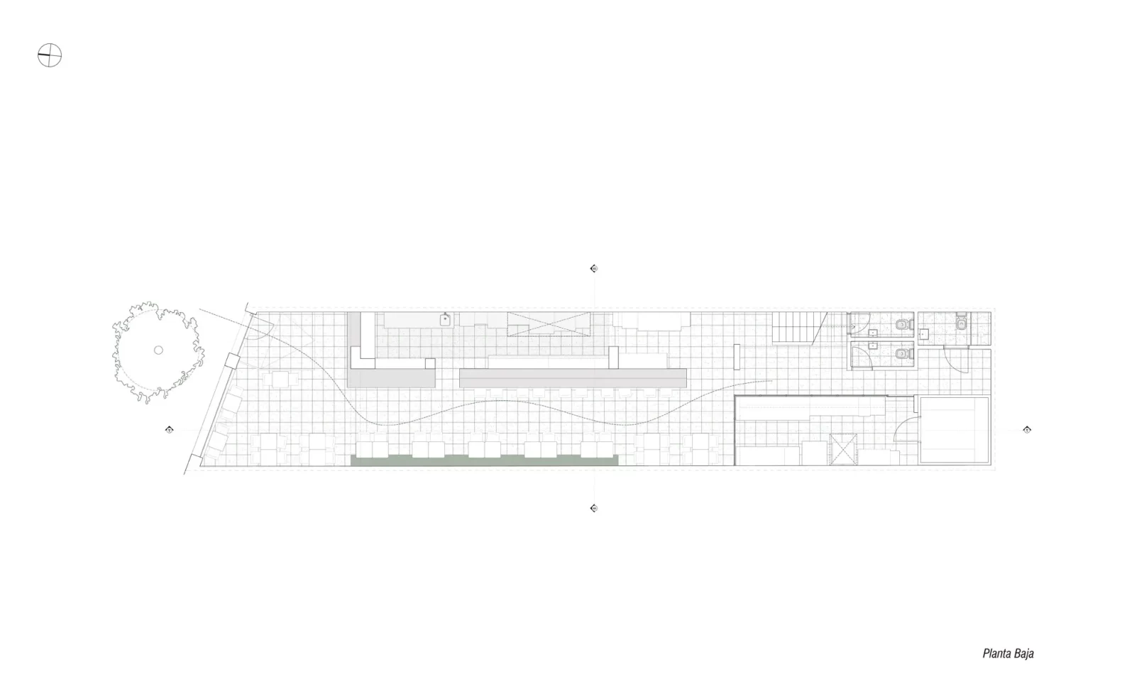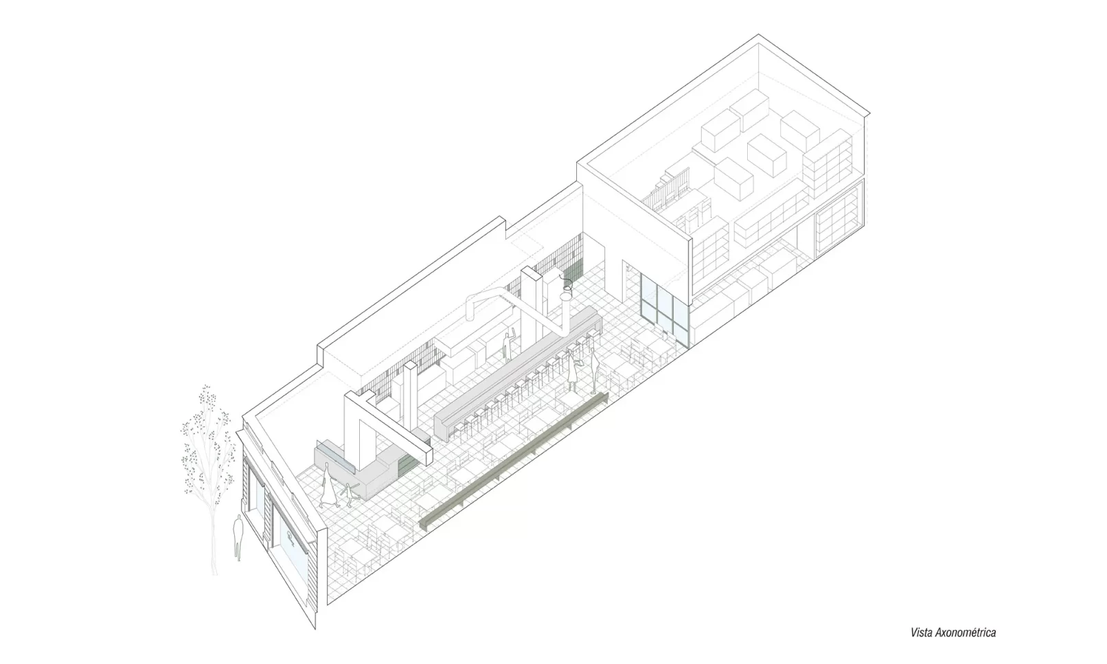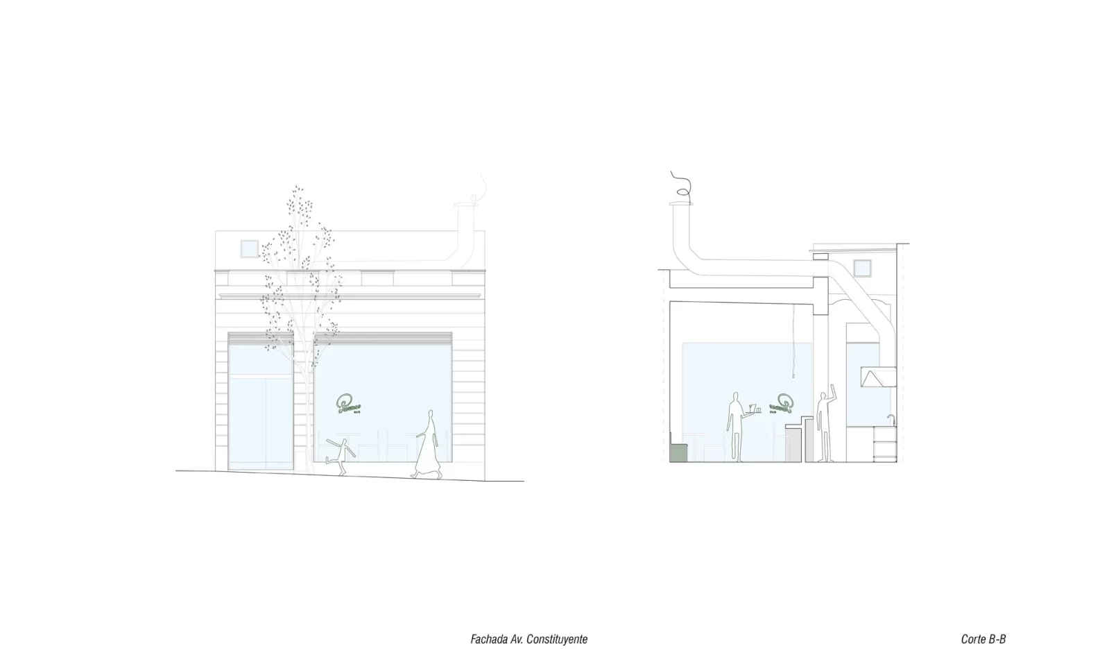 Un restaurant y cafetería de especialidad ubicado sobre la calle Constituyente, en Montevideo, Uruguay. En una construcción existente de mediados de siglo XX, con una fachada típicade acuerdo al barrio en que se ubica, se interviene este local que en su programa anterior era un gimnasio. A través de puntuales acciones, se busca adaptar el nuevo programa, exacerbando y jerarquizando las proporciones ya dadas por la espacialidad existente, respetando así su estructura. Se proyecta una barra lineal de hormigón de 12 metros de largo, que acompañada por una luminaria en todo su recorrido,oficia de límite entre la cocina y el salón, reforzando la profundidad del local. En frente se diseña un banco del mismo largo, que potencia aún más esa direccionalidad, y define el sector de mesas y sillas del salón.Por otro lado, se descarna la pared principal de piedra y ladrillo, dejando en evidencia la antigüedad de la construcción, buscando destacarla con unas luminarias a lo largo de todo el recorrido. En el remate del local, un volumen de hierro y vidrio se enciende, la pastelería, donde nuevamente la zona de producción se exhibe y pasa a ser parte de la experienciadel lugar.