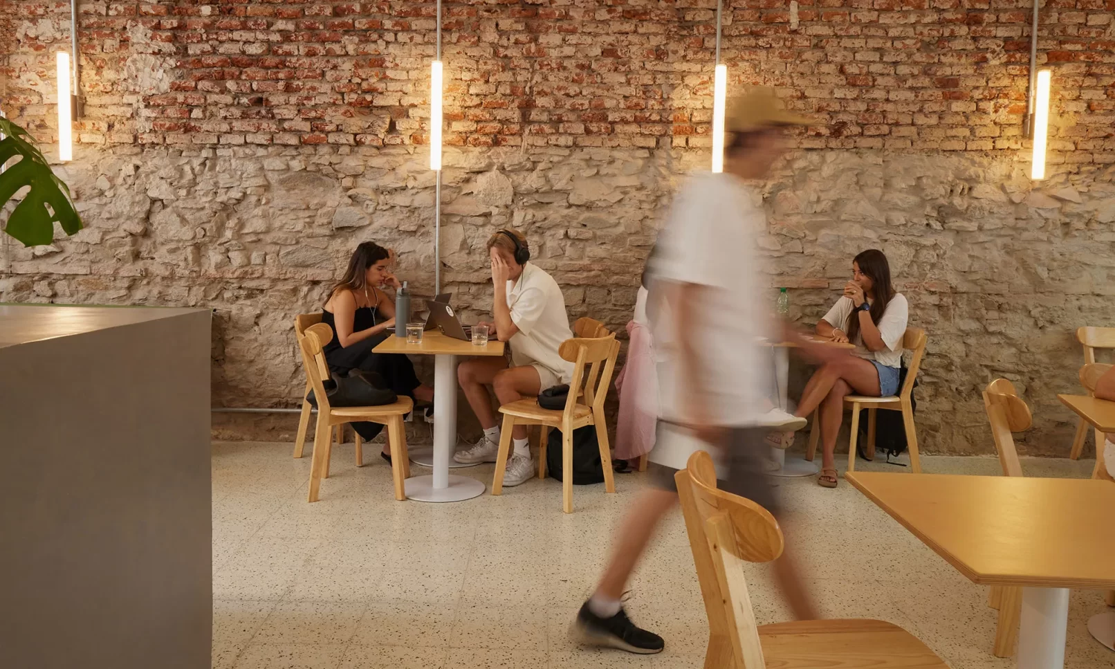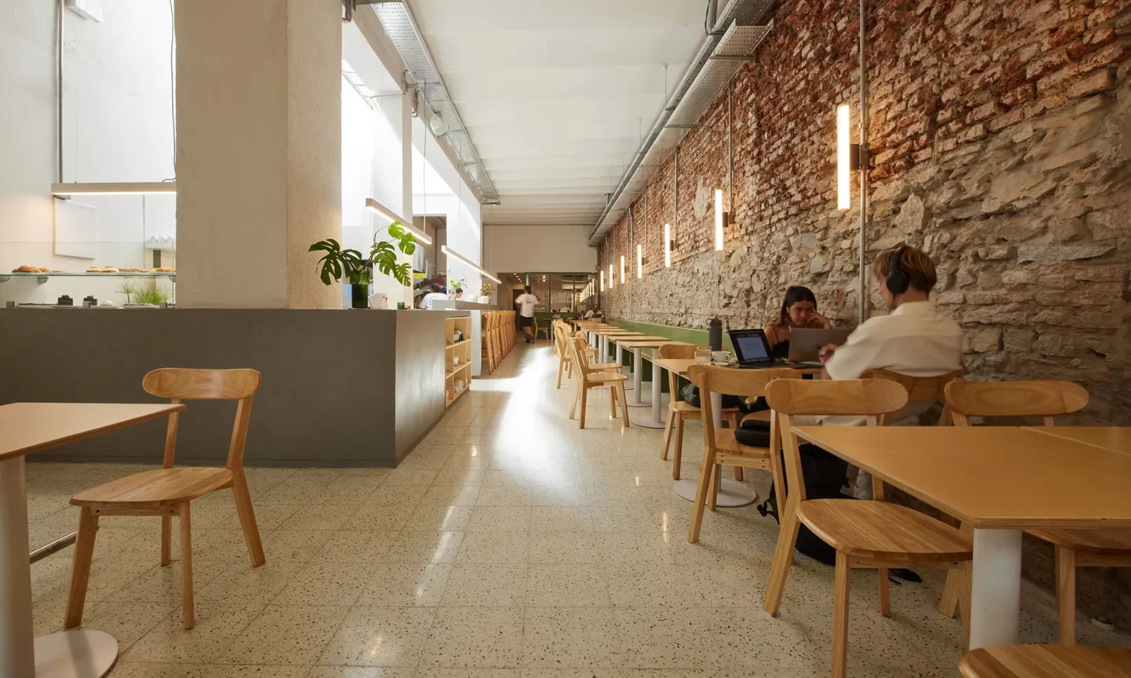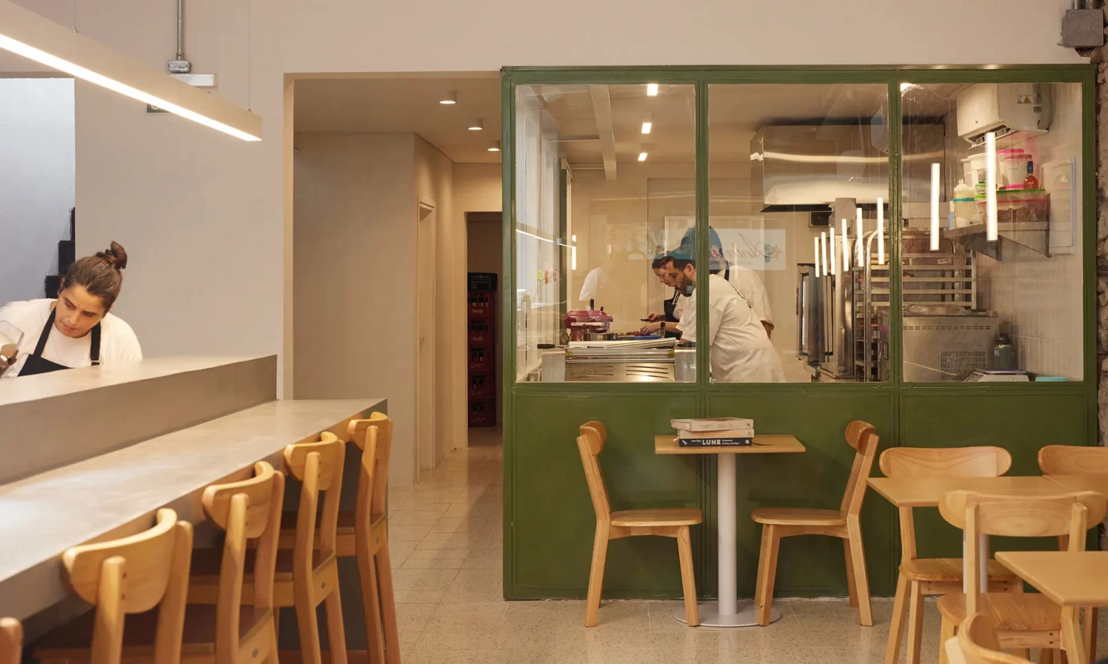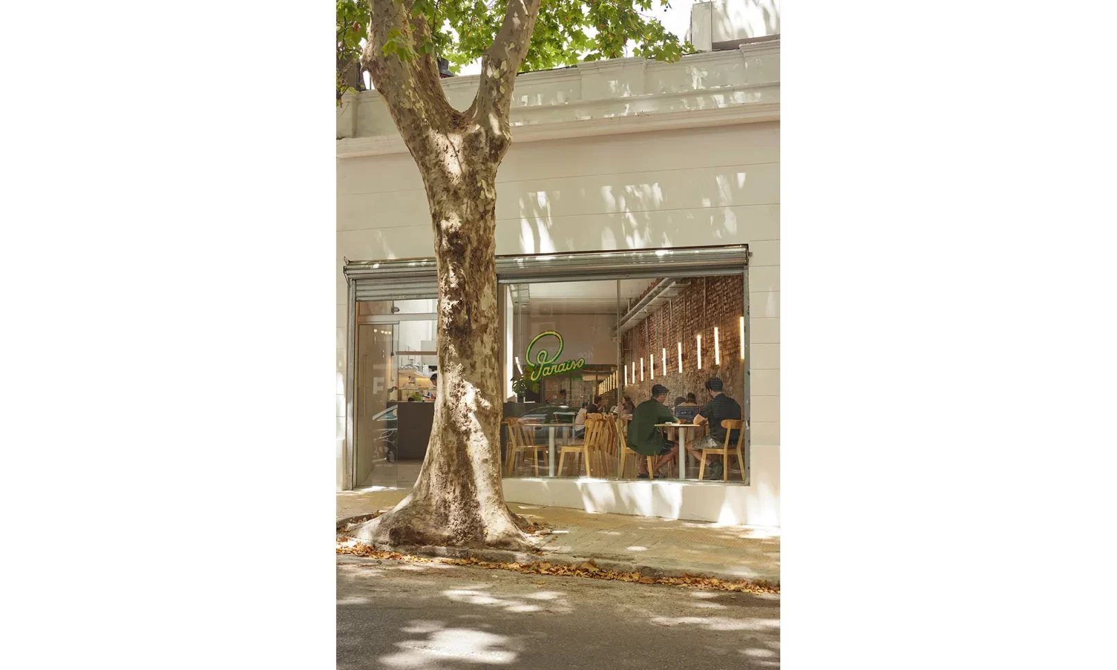 Un restaurant y cafetería de especialidad ubicado sobre la calle Constituyente, en Montevideo, Uruguay. En una construcción existente de mediados de siglo XX, con una fachada típicade acuerdo al barrio en que se ubica, se interviene este local que en su programa anterior era un gimnasio. A través de puntuales acciones, se busca adaptar el nuevo programa, exacerbando y jerarquizando las proporciones ya dadas por la espacialidad existente, respetando así su estructura. Se proyecta una barra lineal de hormigón de 12 metros de largo, que acompañada por una luminaria en todo su recorrido,oficia de límite entre la cocina y el salón, reforzando la profundidad del local. En frente se diseña un banco del mismo largo, que potencia aún más esa direccionalidad, y define el sector de mesas y sillas del salón.Por otro lado, se descarna la pared principal de piedra y ladrillo, dejando en evidencia la antigüedad de la construcción, buscando destacarla con unas luminarias a lo largo de todo el recorrido. En el remate del local, un volumen de hierro y vidrio se enciende, la pastelería, donde nuevamente la zona de producción se exhibe y pasa a ser parte de la experienciadel lugar.