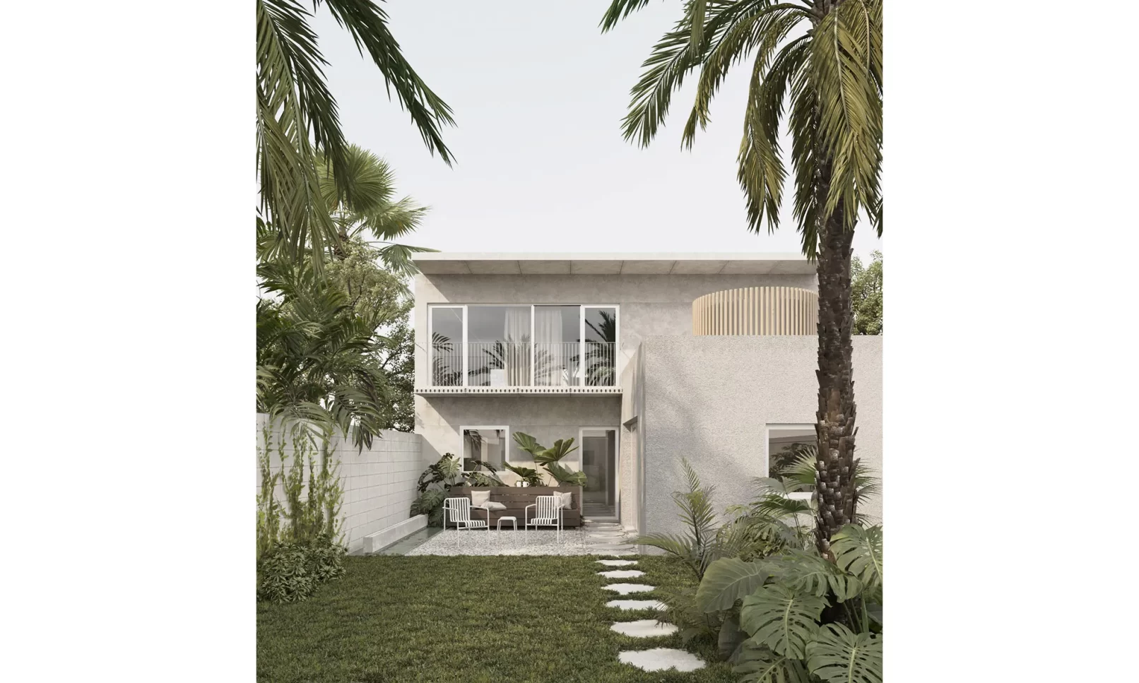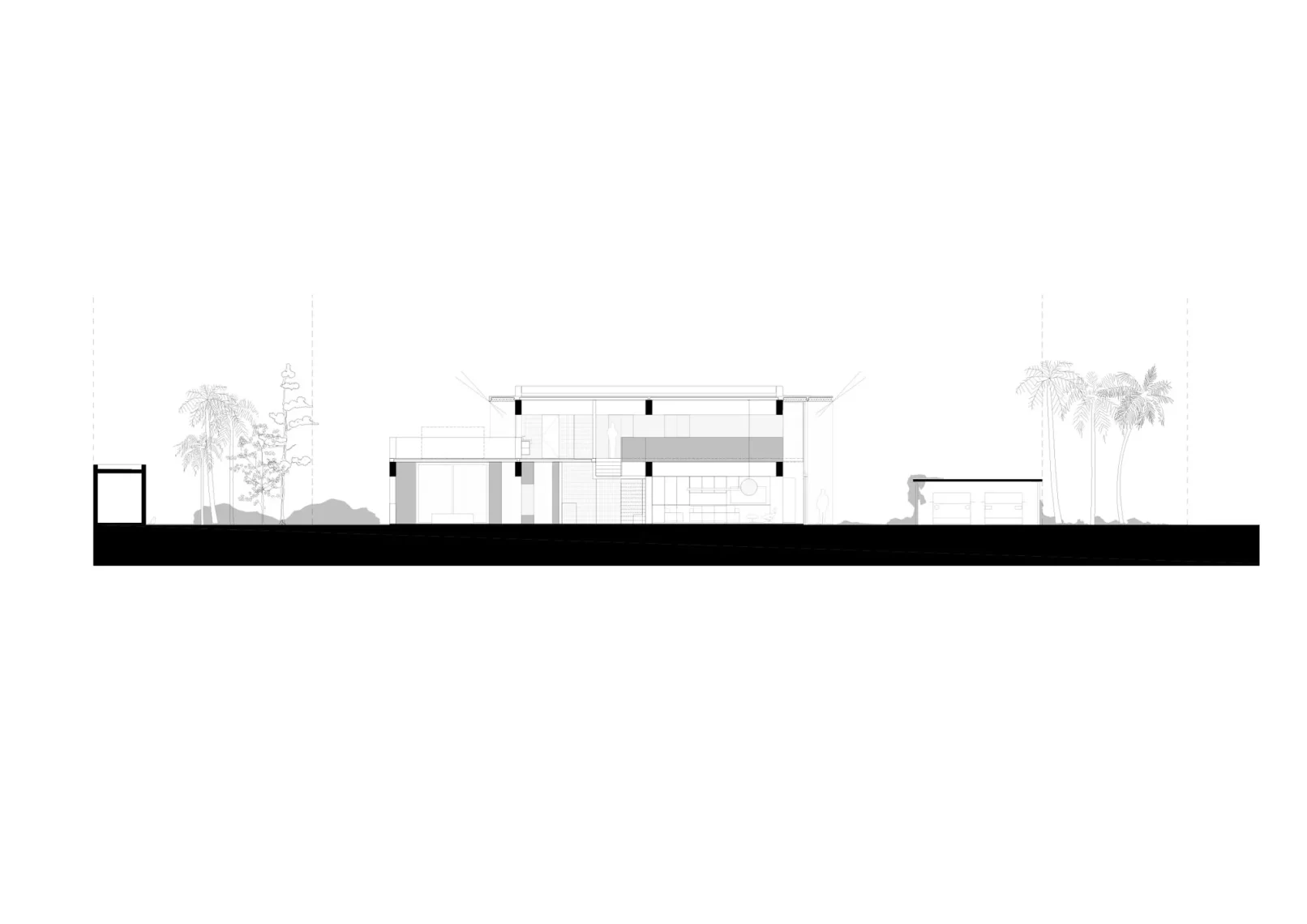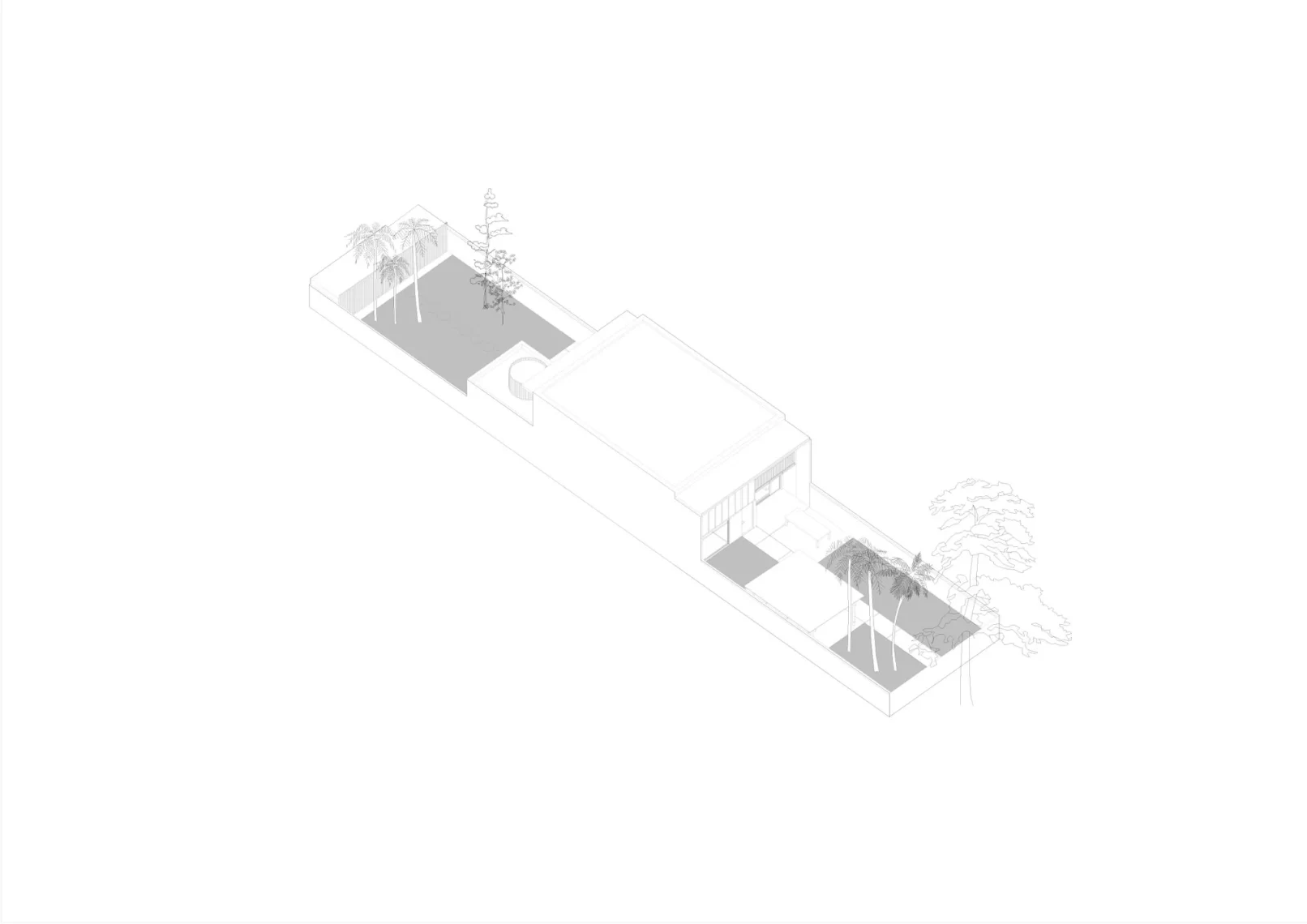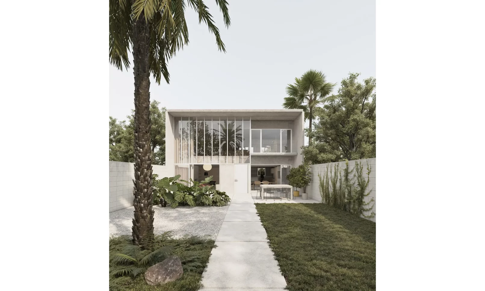 El proyecto se implanta en la mitad del padrón dejando un gran espacio verde al frente, priorizando la vegetación existente de palmeras y arbustos. La zona social al frente en doble altura se abre hacia este gran jardín, y luego la zona íntima se abre hacia el jardín del fondo, de escala más pequeña. La cubierta también se pensó en losa hueca, dejando así una propuesta integral en un sistema prefabricado. El proyecto propone dejar la estructura a la vista, siendo protagonista dentro de la espacialidad que se genera, develando una fuerte impronta y carácter.