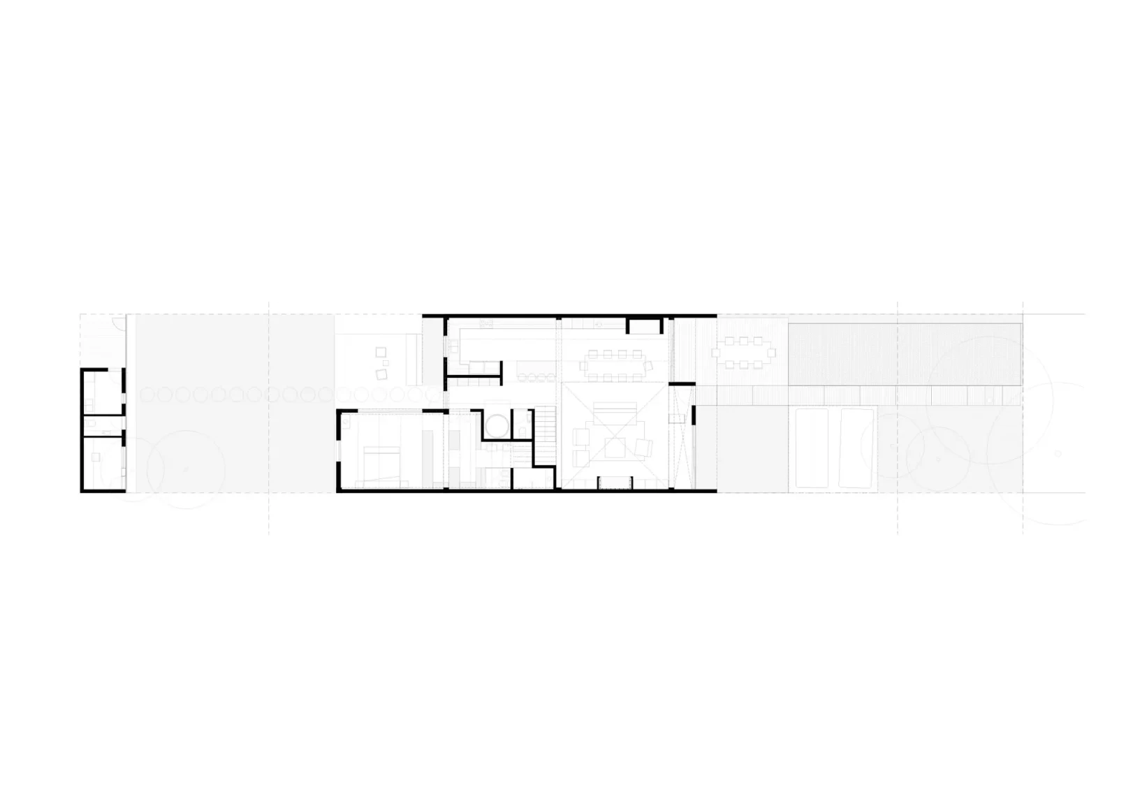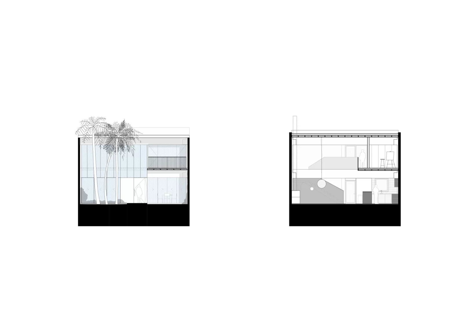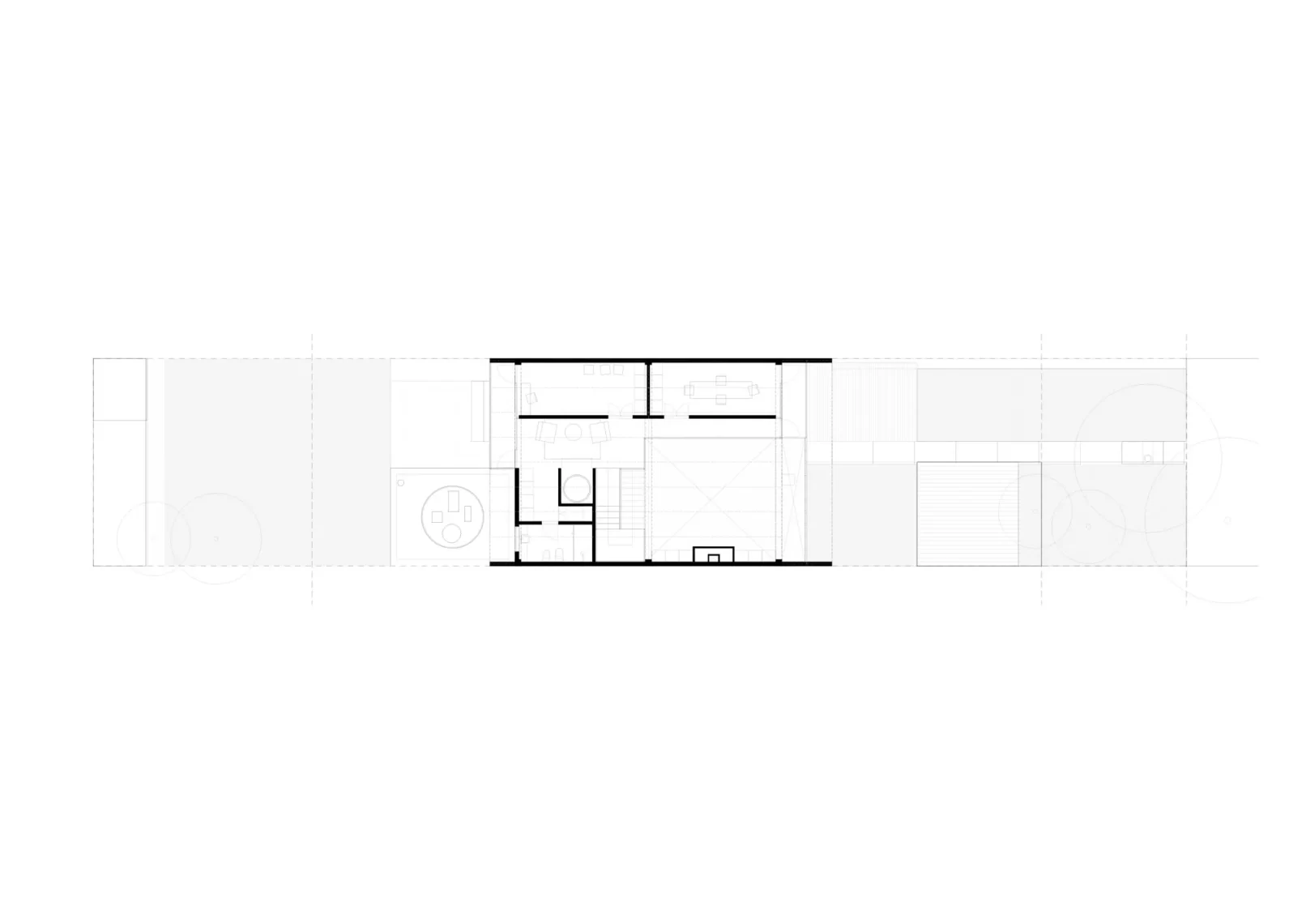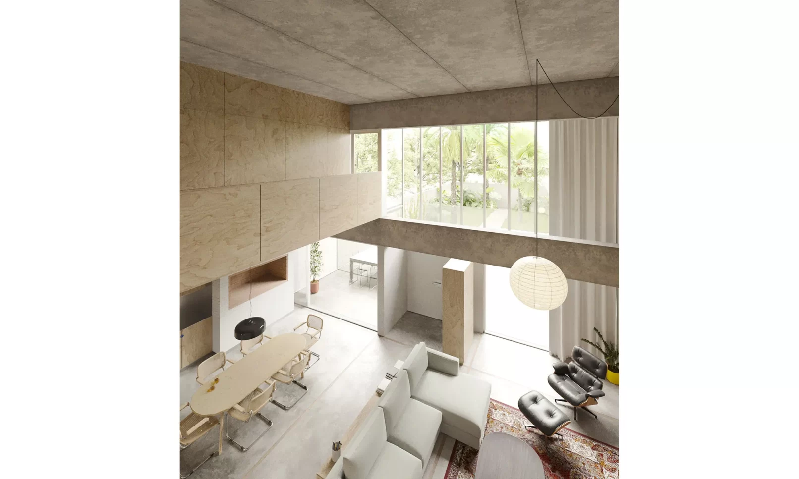 El proyecto se implanta en la mitad del padrón dejando un gran espacio verde al frente, priorizando la vegetación existente de palmeras y arbustos. La zona social al frente en doble altura se abre hacia este gran jardín, y luego la zona íntima se abre hacia el jardín del fondo, de escala más pequeña. La cubierta también se pensó en losa hueca, dejando así una propuesta integral en un sistema prefabricado. El proyecto propone dejar la estructura a la vista, siendo protagonista dentro de la espacialidad que se genera, develando una fuerte impronta y carácter.