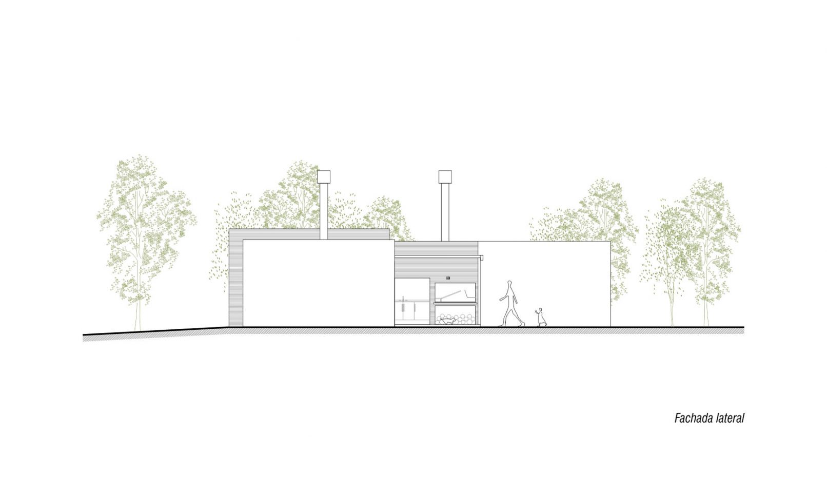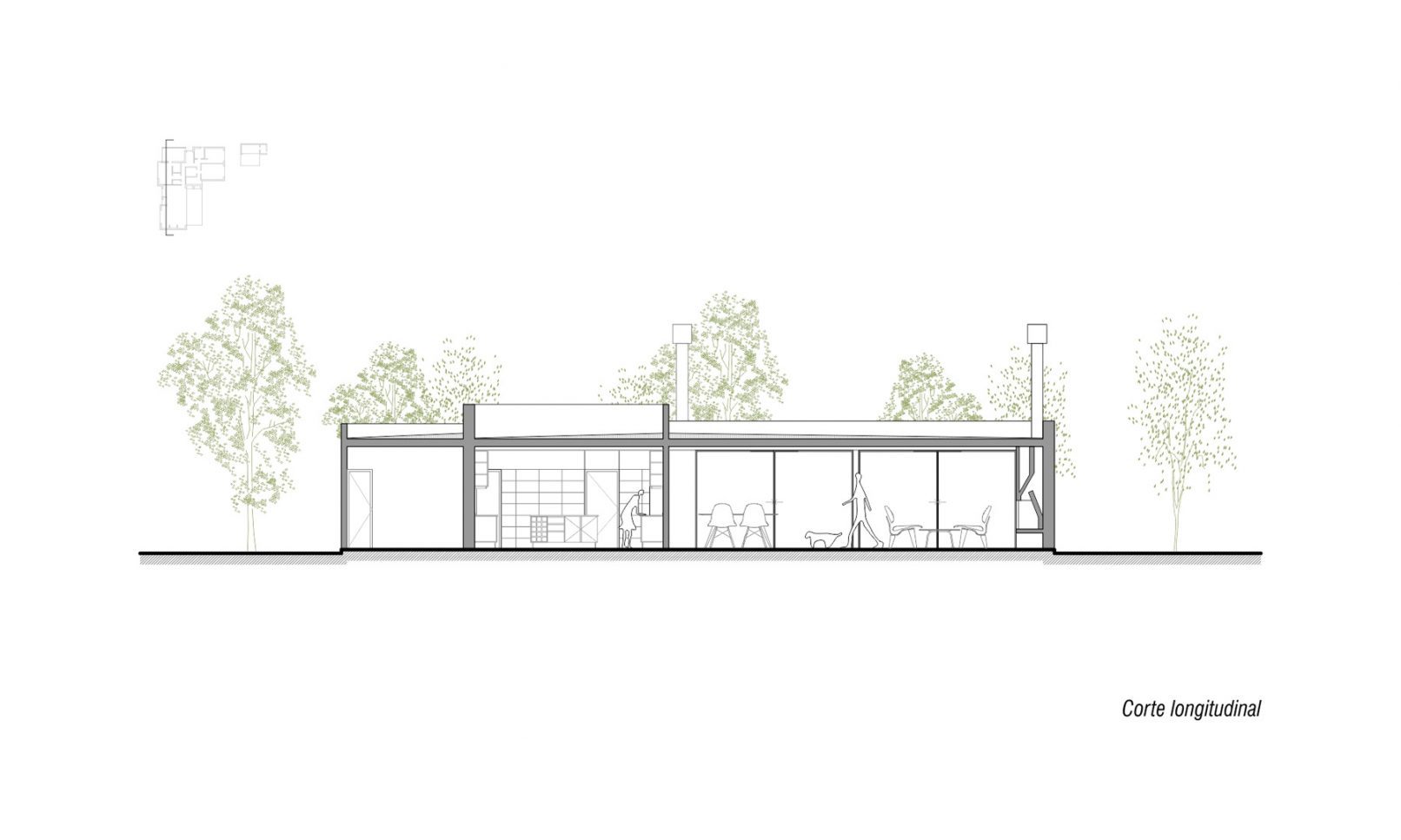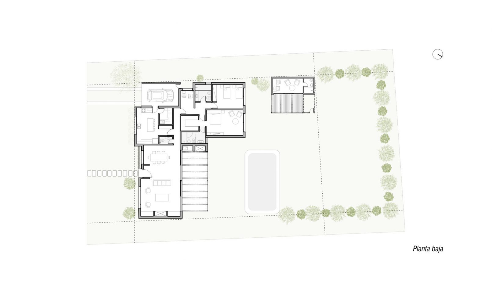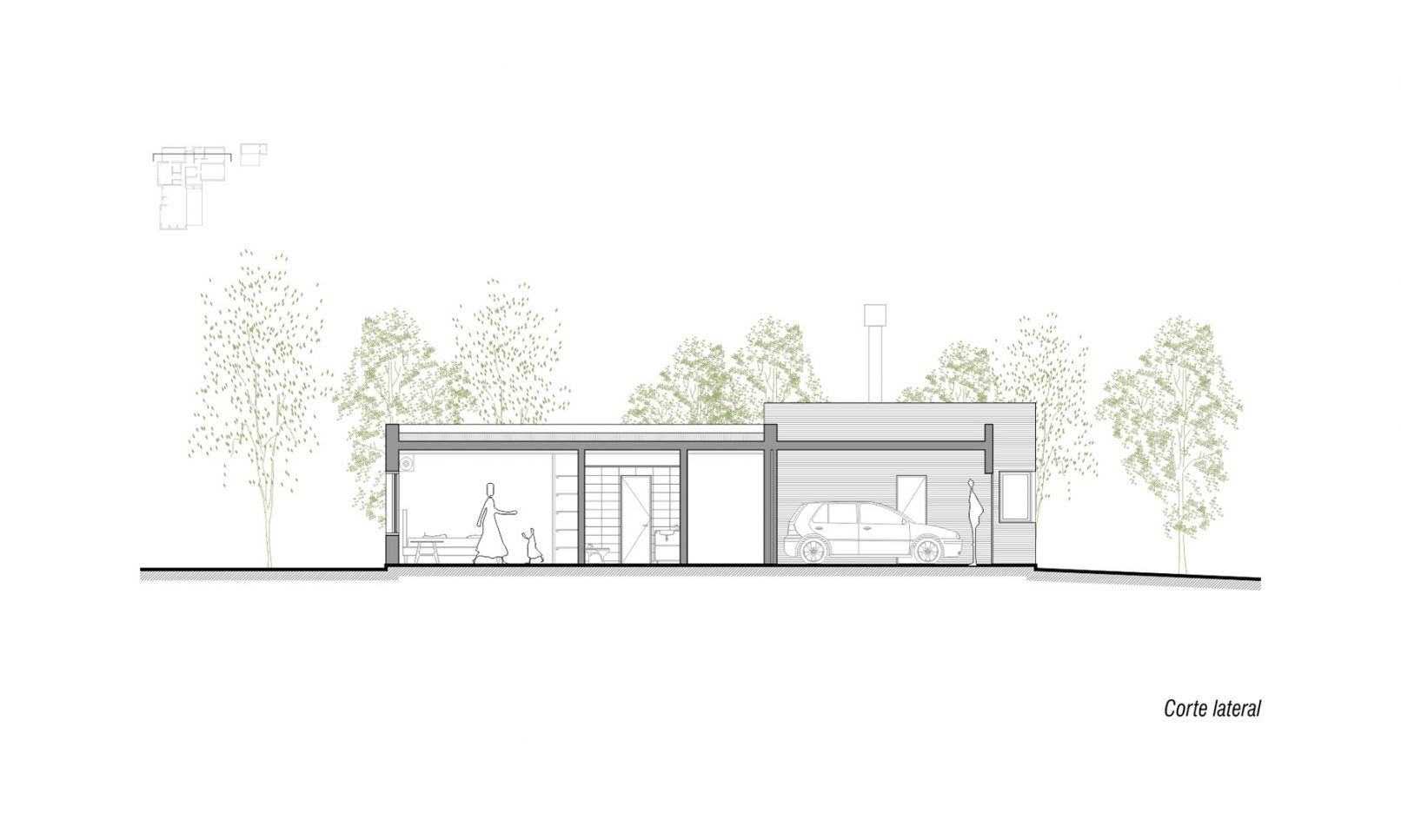 Se proyecta una vivienda en un nivel que se abre hacia la orientación norte, en forma de L. La cocina se ubica en el vértice de esa L, oficiando de articulador del sector íntimo y del social. El Living comedor se posiciona sobre la fachada principal, paralelo a la calle permitiéndose la condición del relacionamiento entre frente y fondo. Se prevé un sector para la ubicación de una escalera que hoy se denomina como escritorio, previendo un crecimiento de una segunda planta a futuro.
