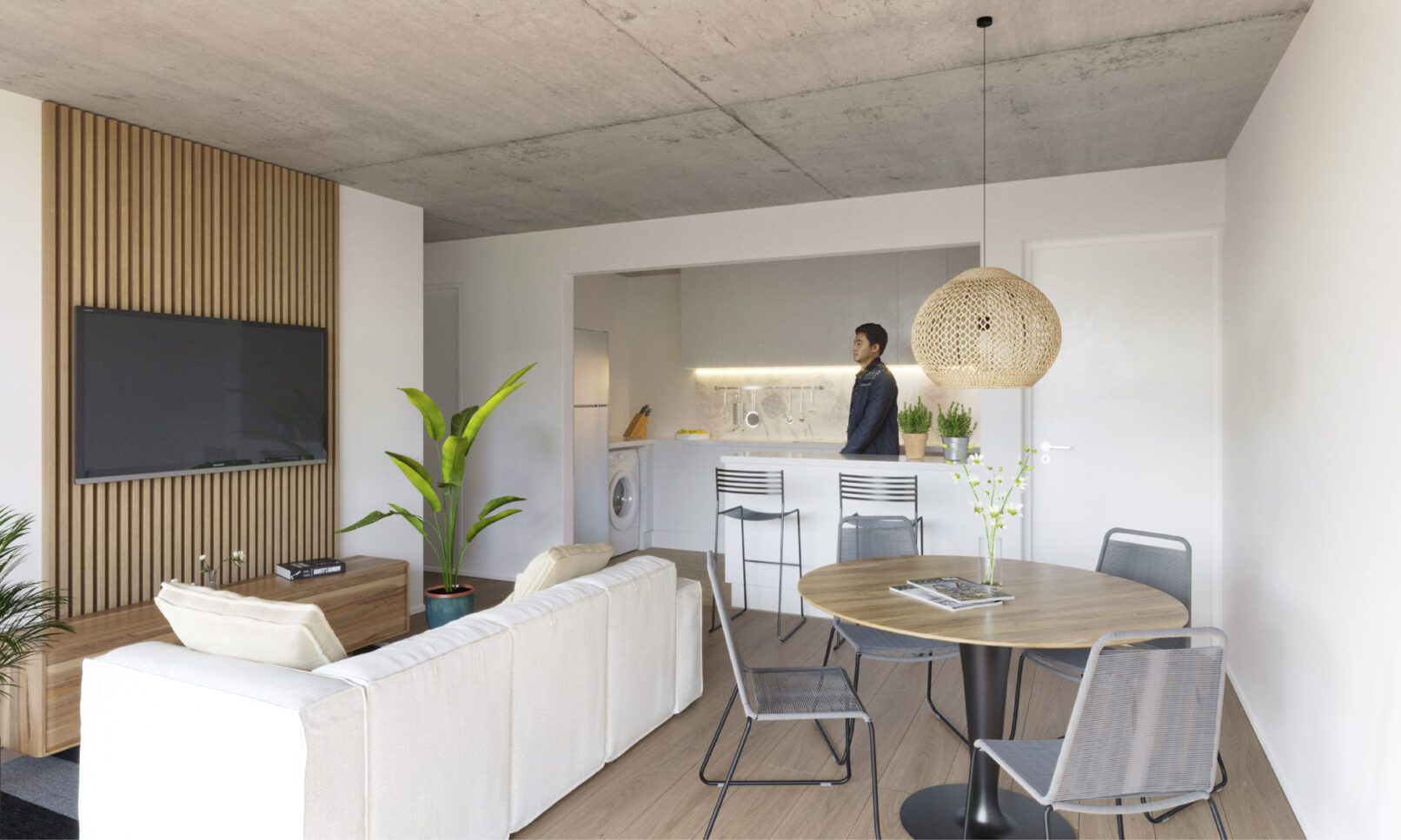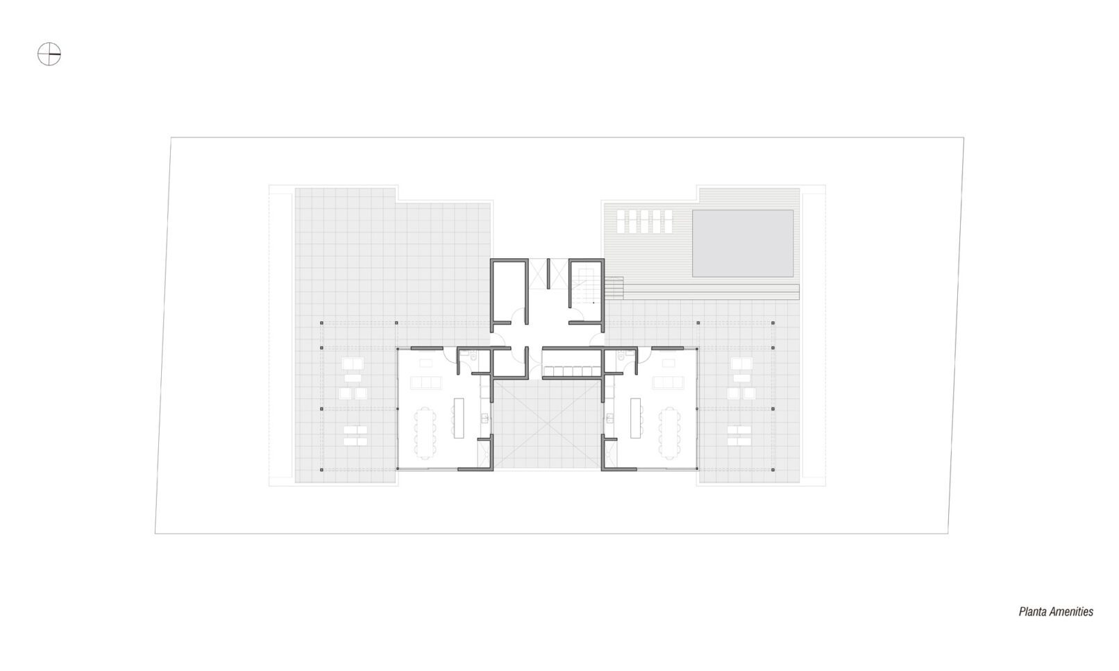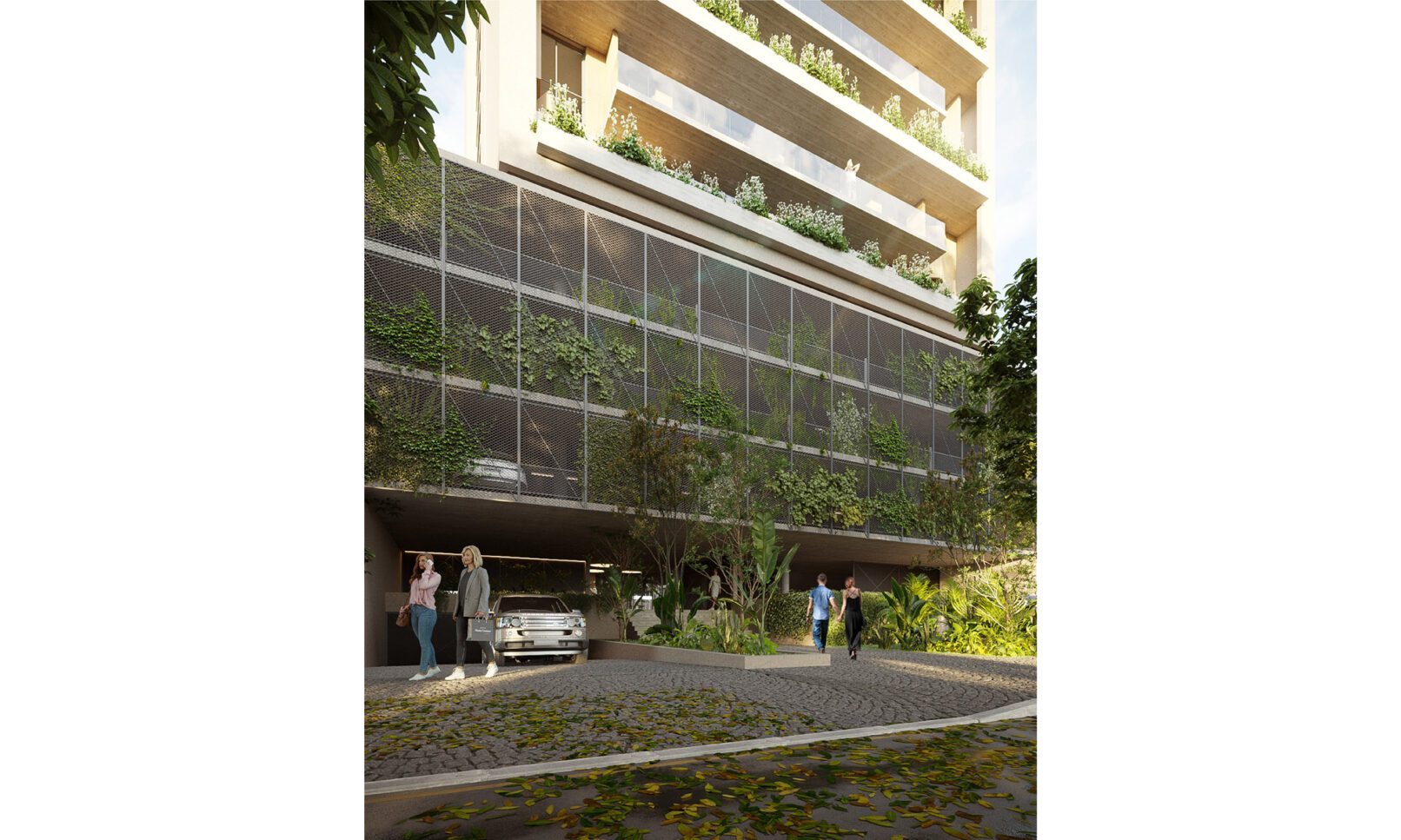El edificio ubicado en Avda. España cuenta con los primeros niveles de estacionamiento, y los niveles superiores de vivienda. El volumen inferior maximiza la utilización del predio a baja altura para generar 140 plazas de estacionamiento para automóviles y 28 para motos. Mientras, el bloque superior de viviendas aloja 108 apartamentos de uno y dos dormitorios. El conjunto edilicio se corona con una azotea que alberga los amenities que incluyen dos barbacoas, una piscina con deck y una zona de lavadero interior y exterior.
