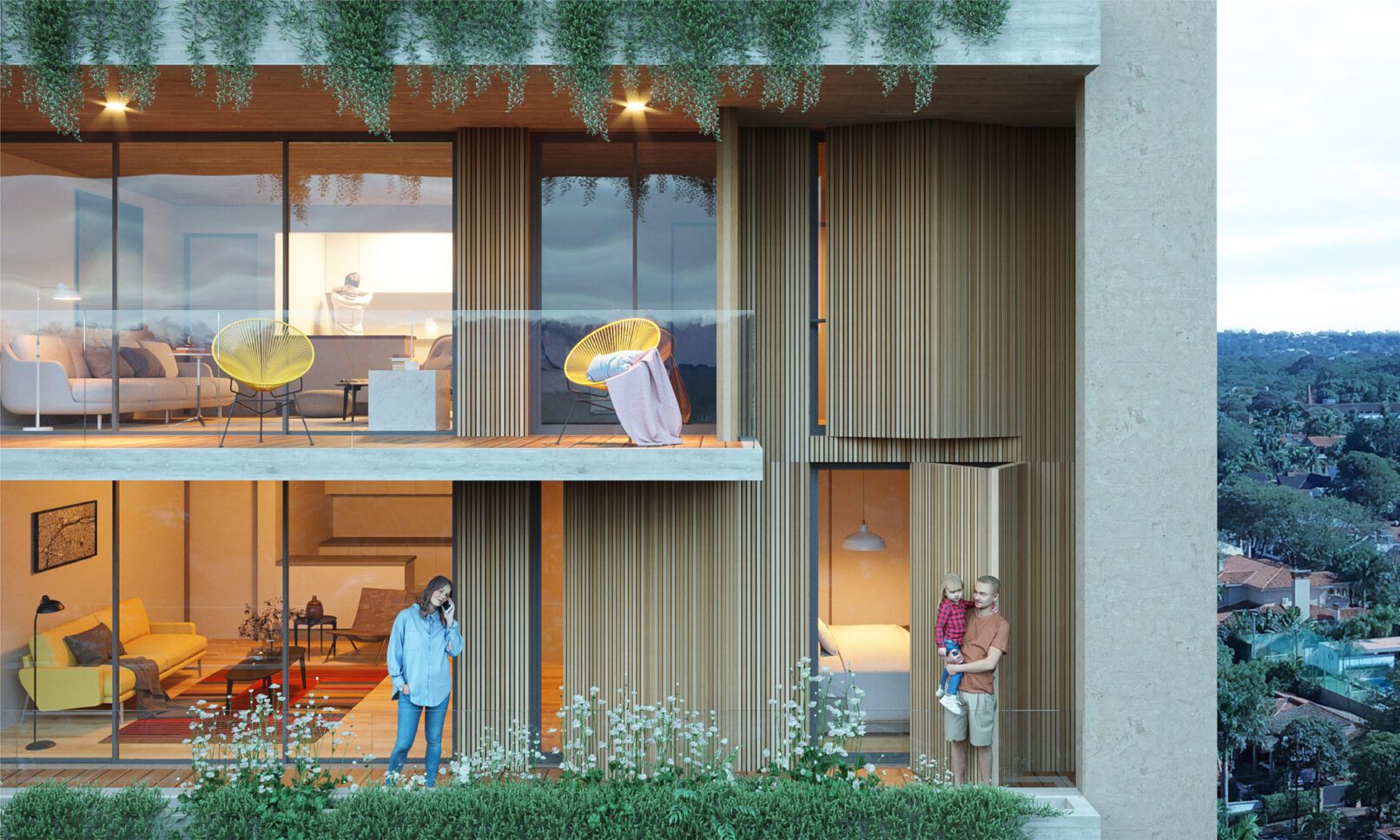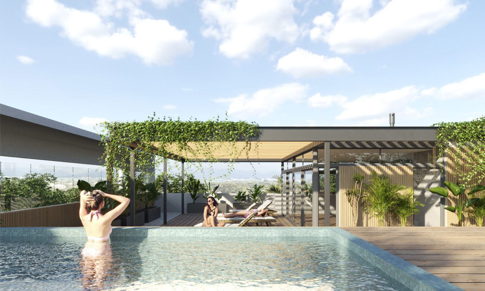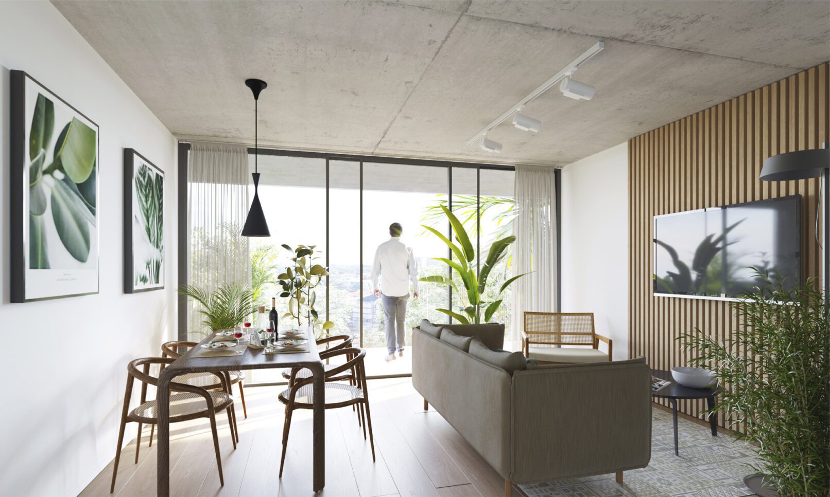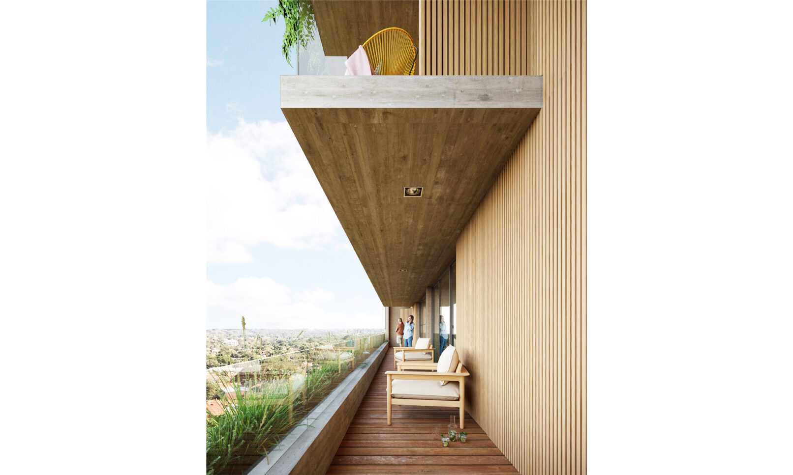 El edificio ubicado en Avda. España cuenta con los primeros niveles de estacionamiento, y los niveles superiores de vivienda. El volumen inferior maximiza la utilización del predio a baja altura para generar 140 plazas de estacionamiento para automóviles y 28 para motos. Mientras, el bloque superior de viviendas aloja 108 apartamentos de uno y dos dormitorios. El conjunto edilicio se corona con una azotea que alberga los amenities que incluyen dos barbacoas, una piscina con deck y una zona de lavadero interior y exterior.