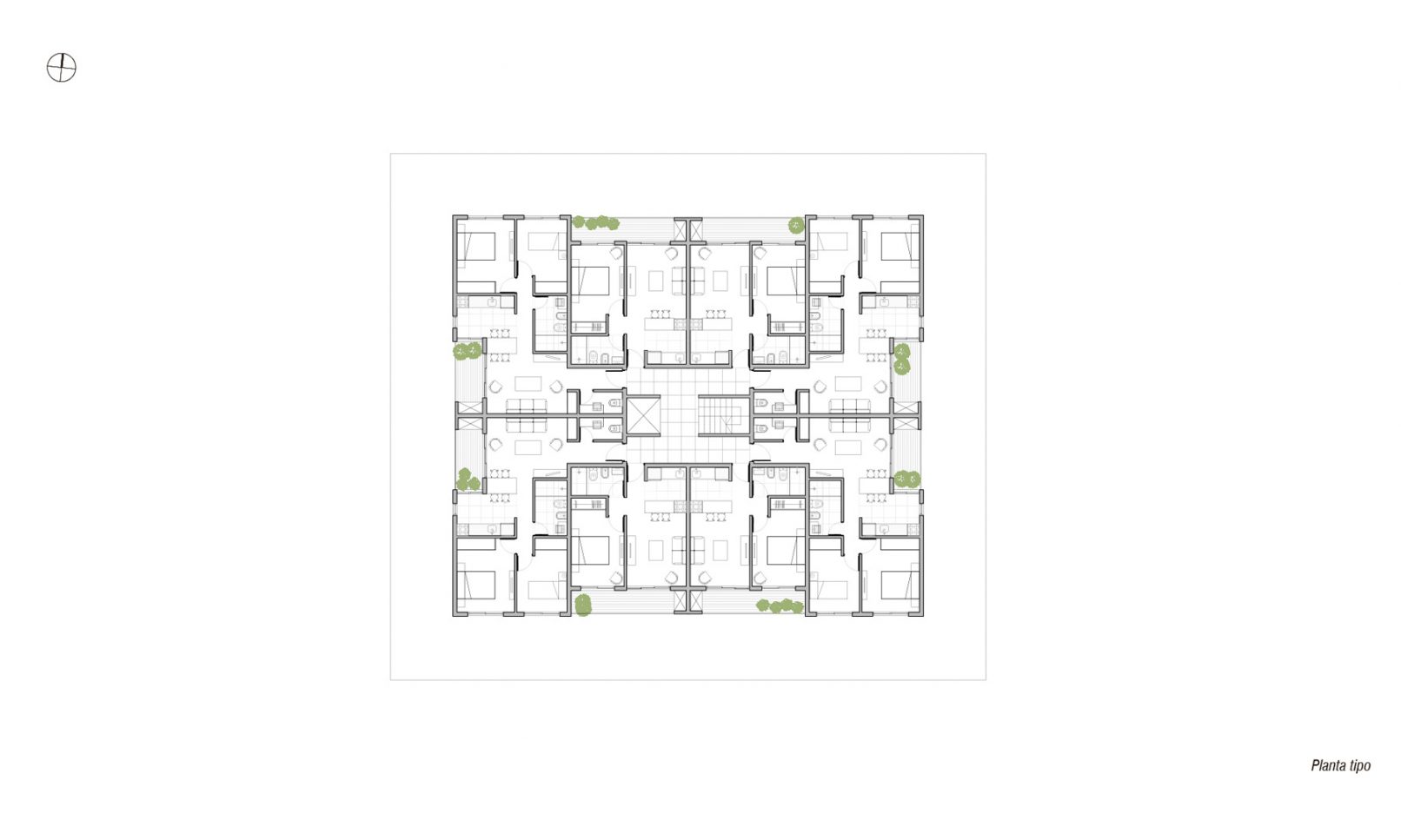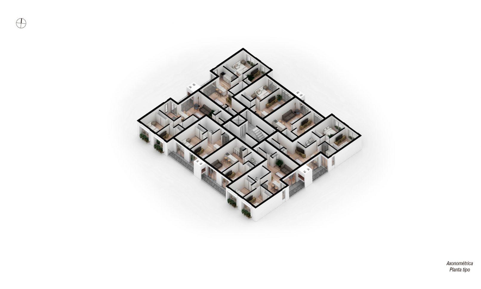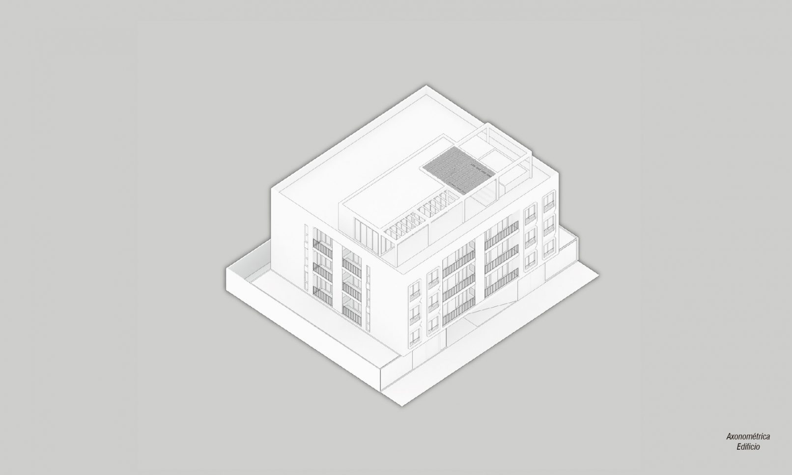 El proyecto se ubica en el municipio de Luque, Paraguay. Se ubicación estratégica garantiza una fácil conectividad con los servicios del entorno. El edificio se implanta como un volumen único de 5 niveles. La planta baja contiene los estacionamientos y el hall de acceso, lo que ocupa casi la totalidad del área del terreno y deja únicamente un retiro hacia la calle. Los siguientes tres niveles generan una volumetría exenta, lo cual permite utilizar todo el perímetro para apartamentos logrando así las condiciones de iluminación y ventilación. Al centro se propone el núcleo de circulación vertical. En la azotea se concentran los amenities, los cuales se separan de los bordes para potenciar la volumetría. La piel de ladrillo y el abundante uso de vegetación buscan referir a la cultura local.