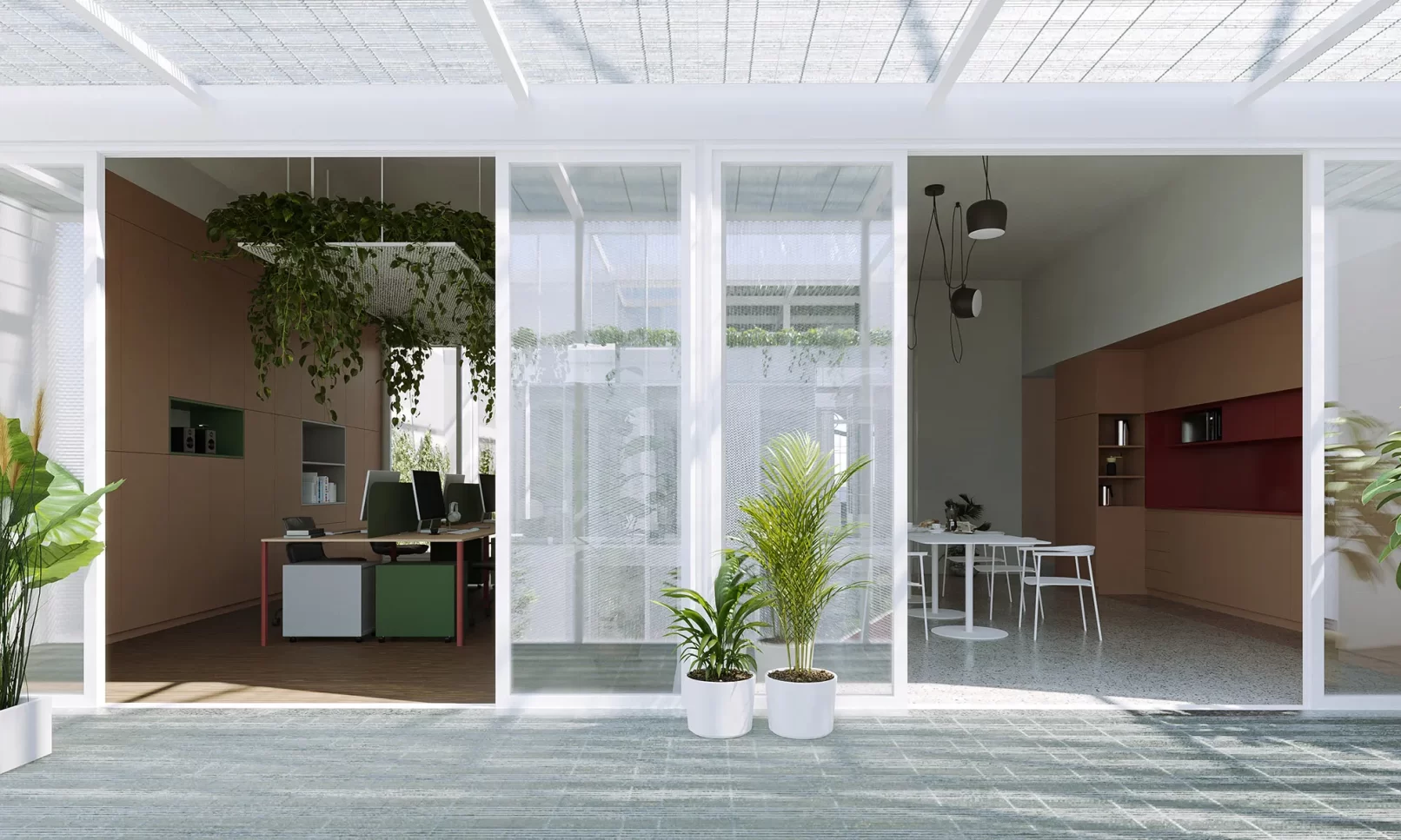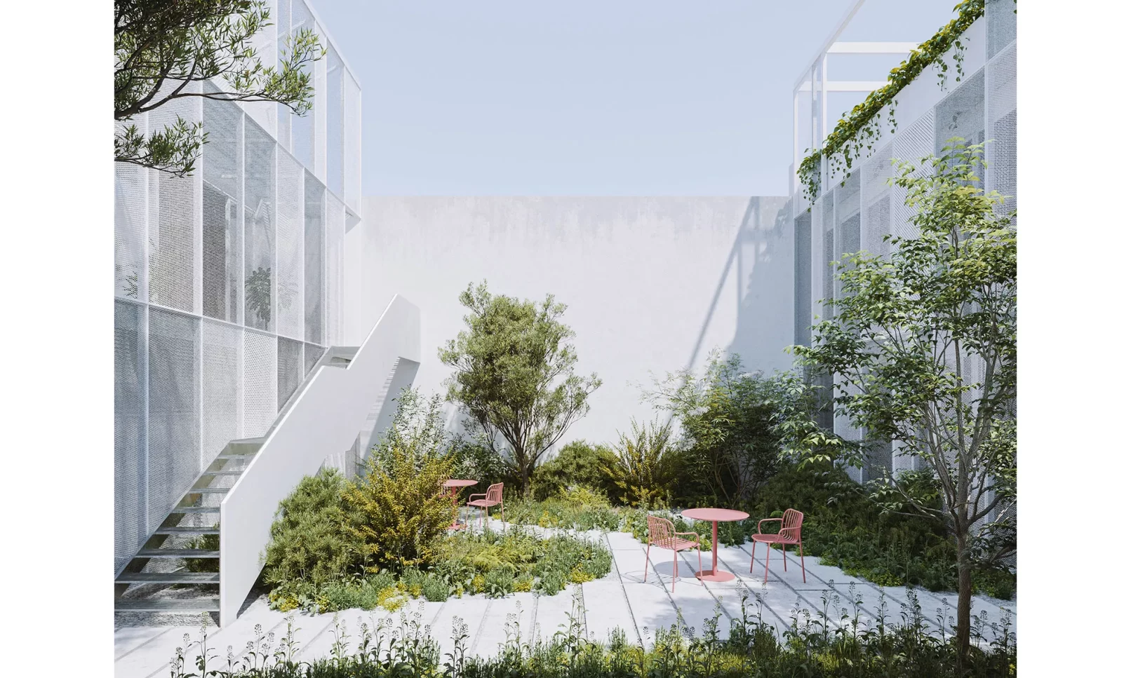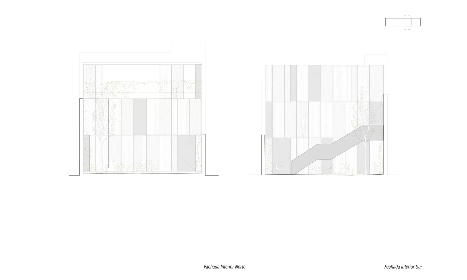 Ambos volúmenes dialogan mediante un lenguaje común de fachada, que se materializa en una piel semitranslúcida, concebida como un elemento de protección tanto física como visual para ambos edificios. Esta envolvente de ambos volúmenes juega con diferentes densidades de aperturas, que varían en tamaño y disposición, modulando la privacidad y regulando la relación con el entorno. Este juego de aperturas no solo otorga dinamismo a la fachada, sino que también transforma la percepción del espacio, generando un continuo cambio en la luz y la sombra a lo largo del día, lo que acentúa la interacción entre los volúmenes y el paisaje circundante.
