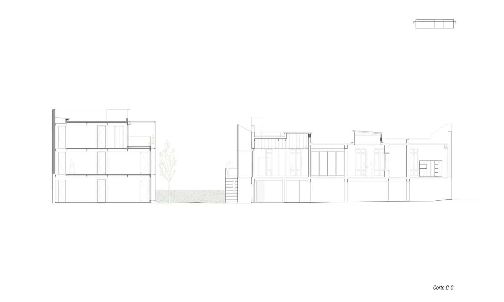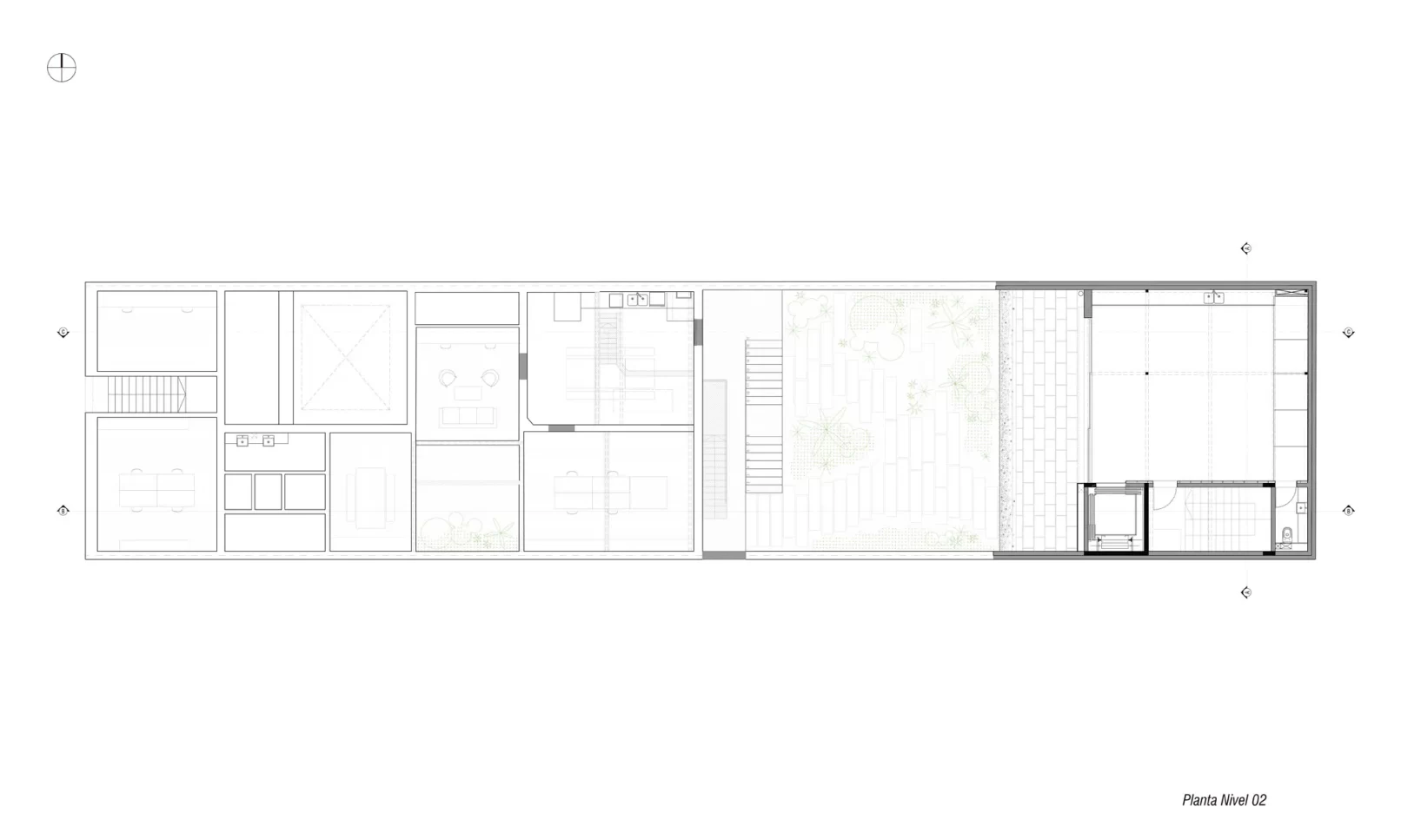 En este sentido, se establece un diálogo entre tradición y contemporaneidad. Se abren espacios hacia el exterior a través de patios que generan una relación más fluida con el entorno y maximizan la luz natural, al mismo tiempo que se crean contrastes de forma y materialidad que resaltan los elementos arquitectónicos originales de la vivienda. En la parte posterior del predio se implanta un nuevo volumen que plantea una relación visual y espacial con la vivienda existente a través de un amplio patio central, con una fuerte presencia de vegetación que crece de manera libre, formando senderos sinuosos que serpentean entre ambos edificios, favoreciendo una circulación fluida y un contacto directo con la naturaleza circundante.