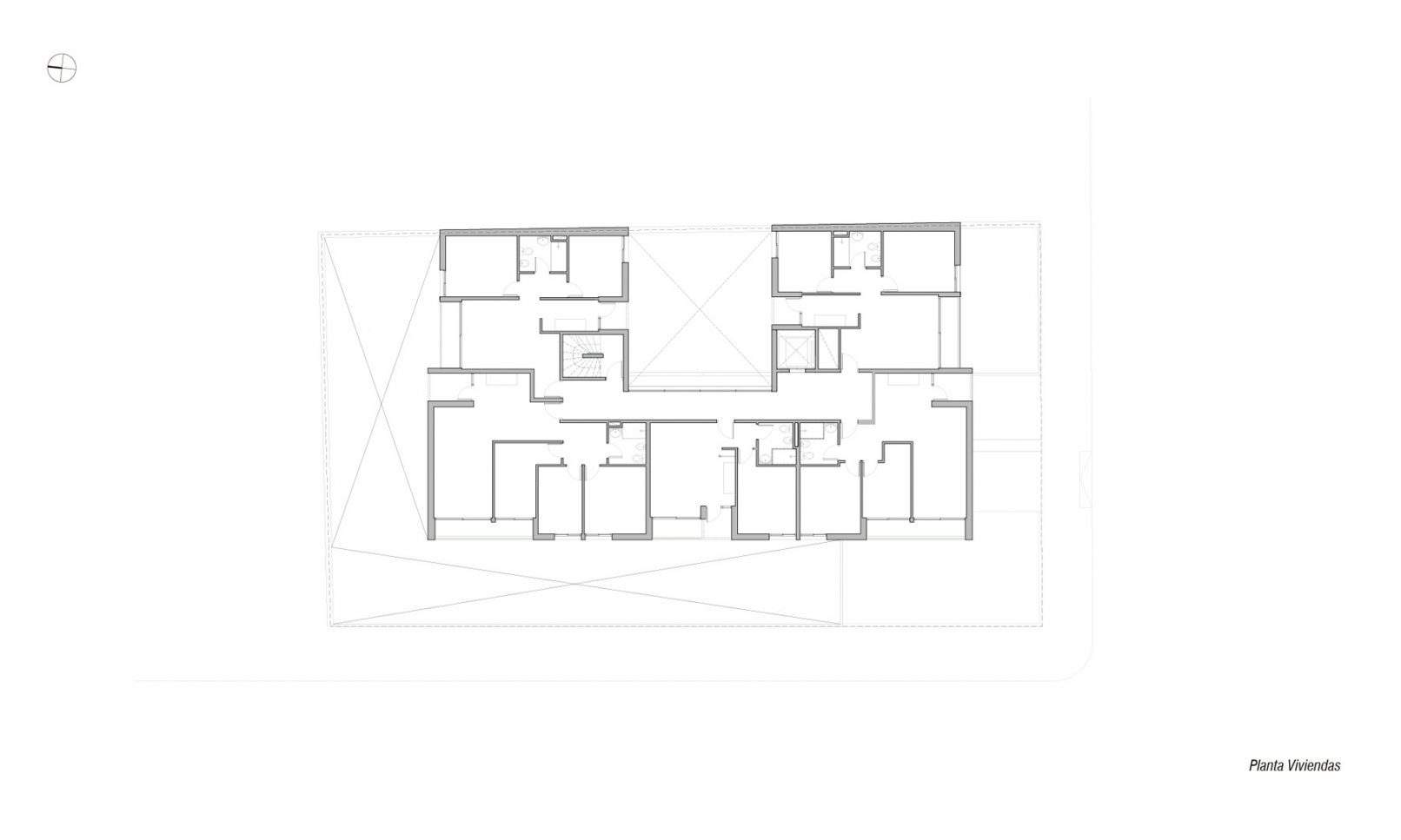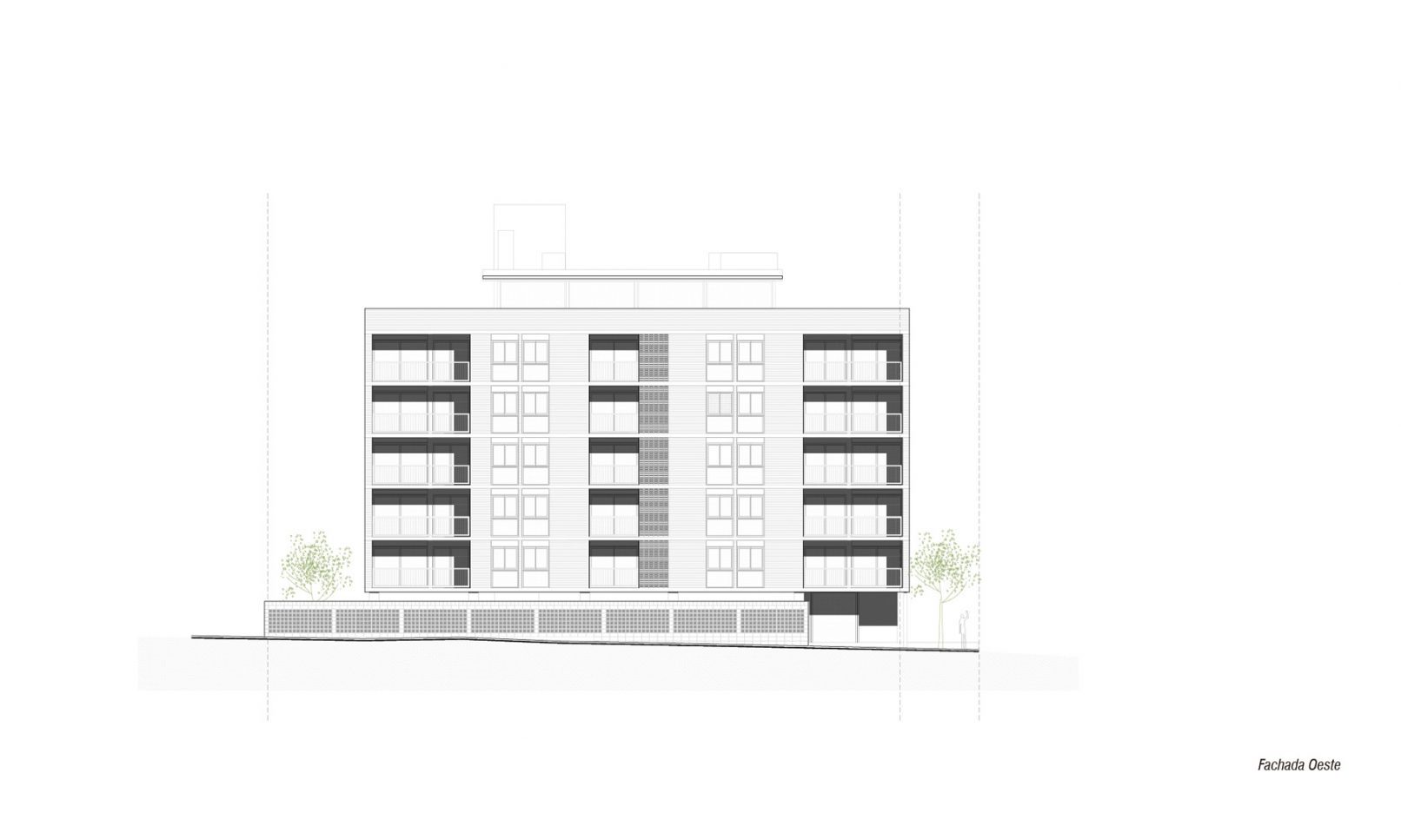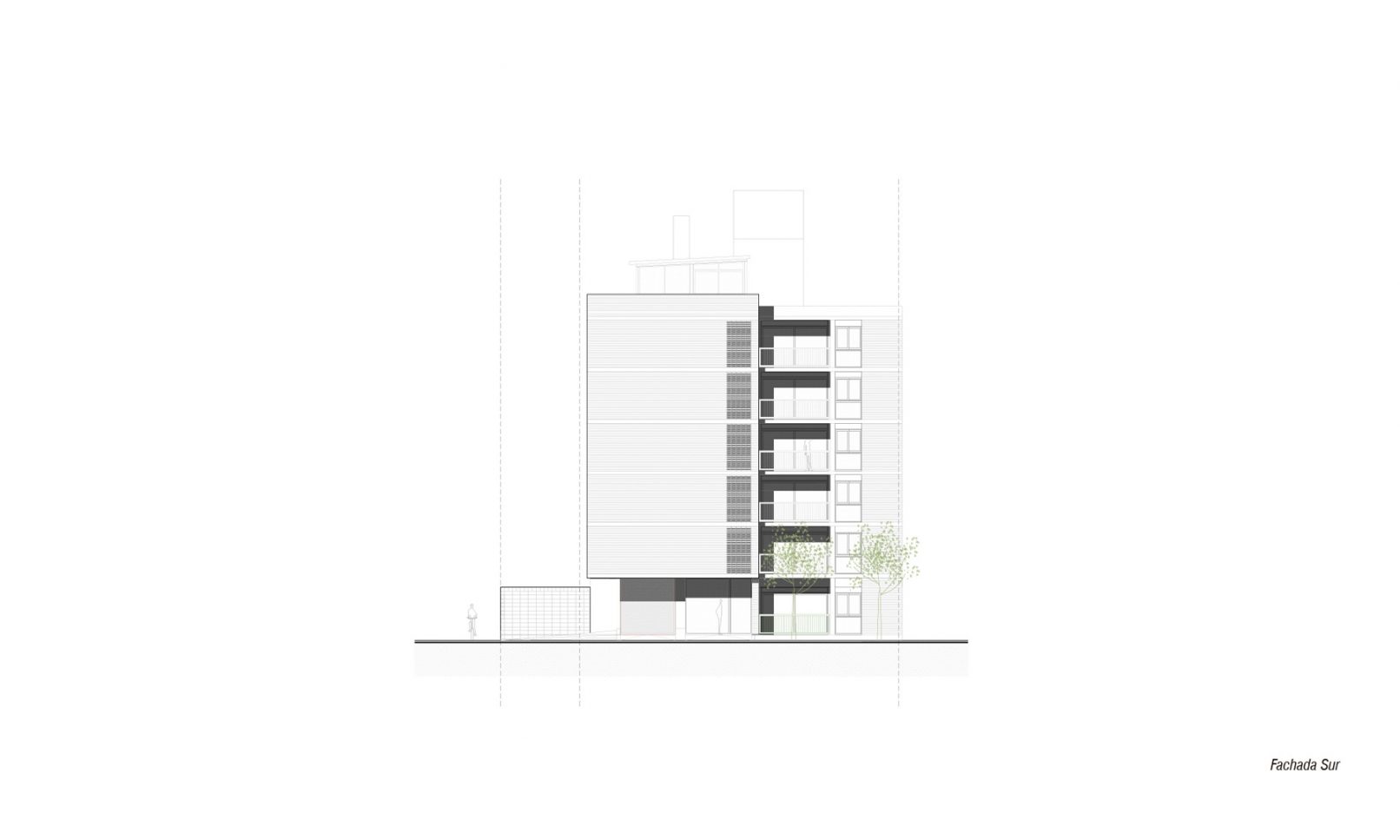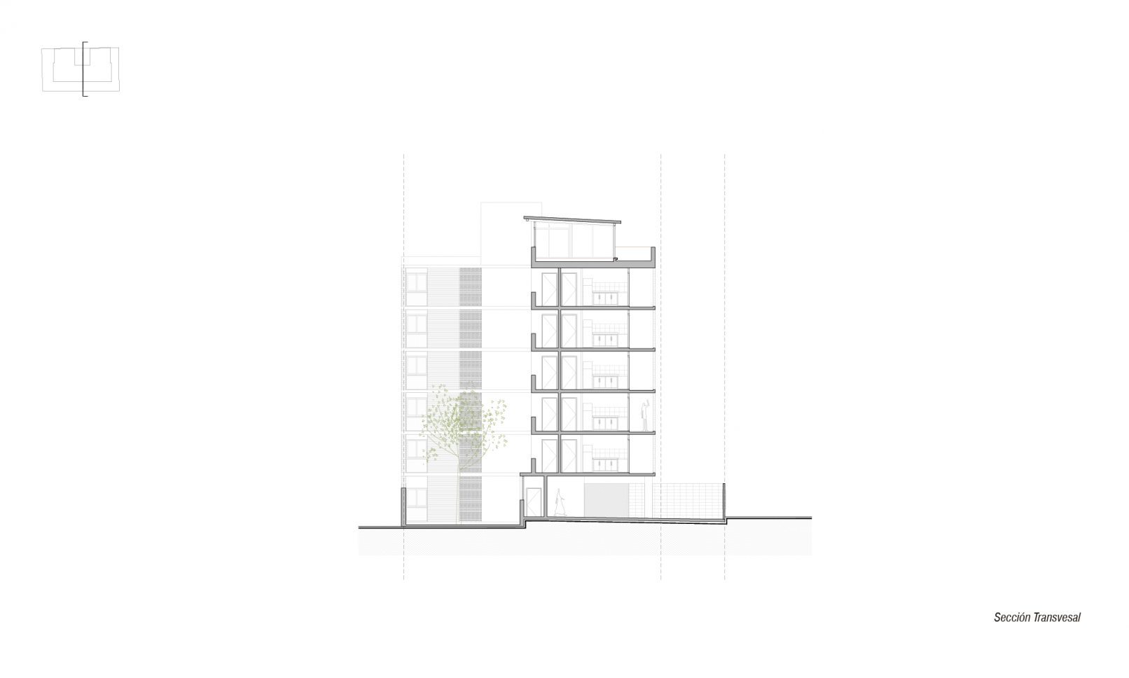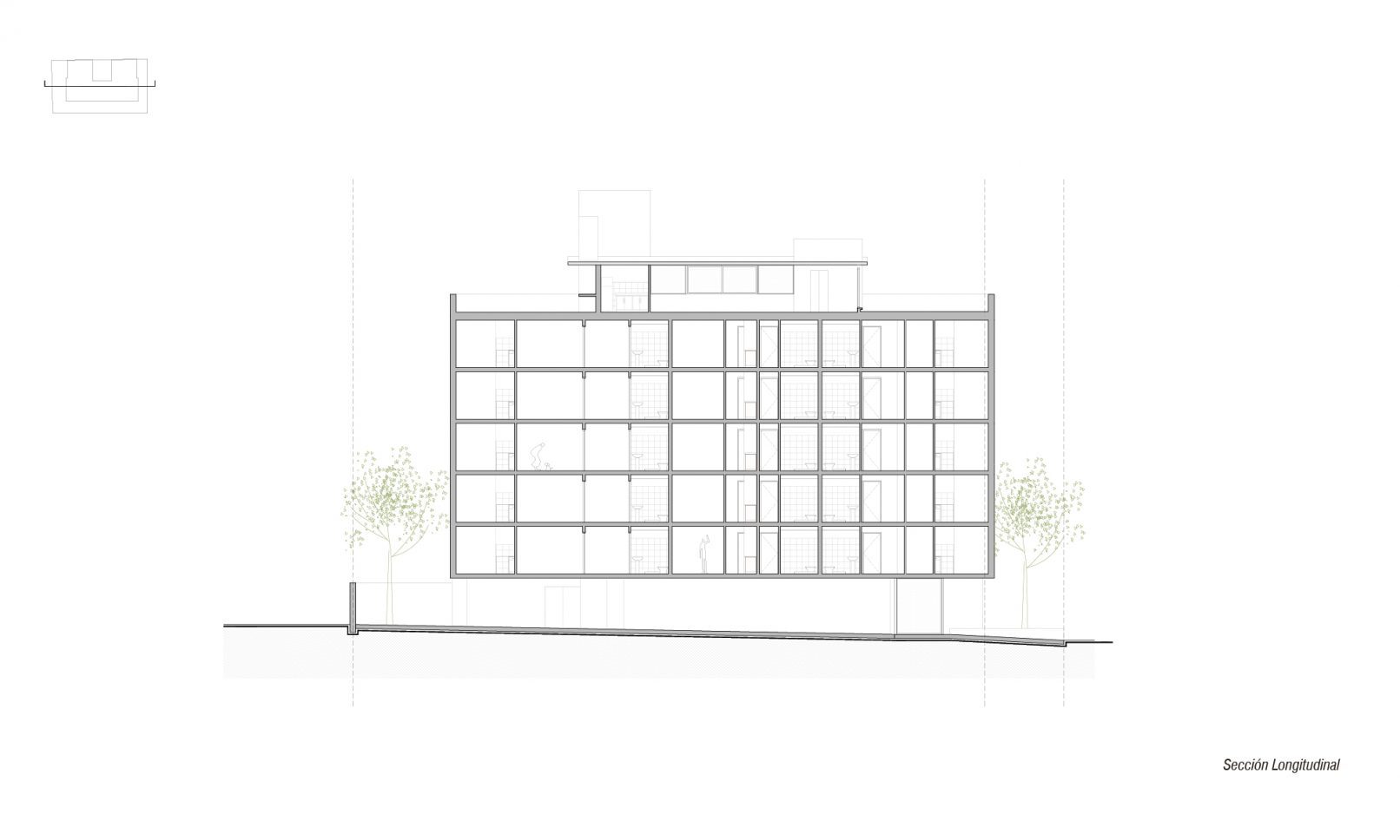 La propuesta se concentra en un único edificio de planta baja y cinco niveles con una planta en forma de U, aportando a la escala edilicia intermedia, relacionándose razonablemente con su entorno. Su piel homogénea de ladrillo visto, interrumpida únicamente por los cantos vistos de las losas de hormigón, genera ritmo y escala al conjunto.