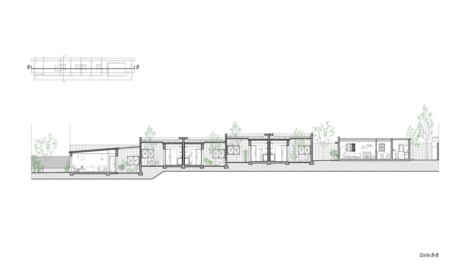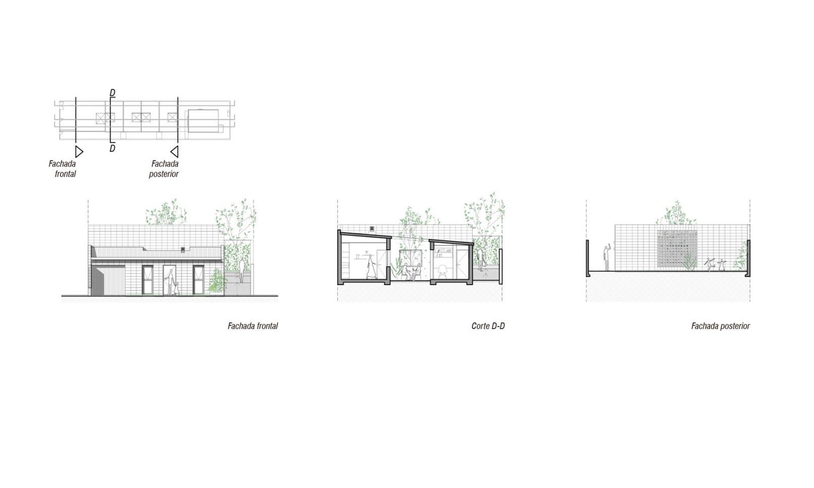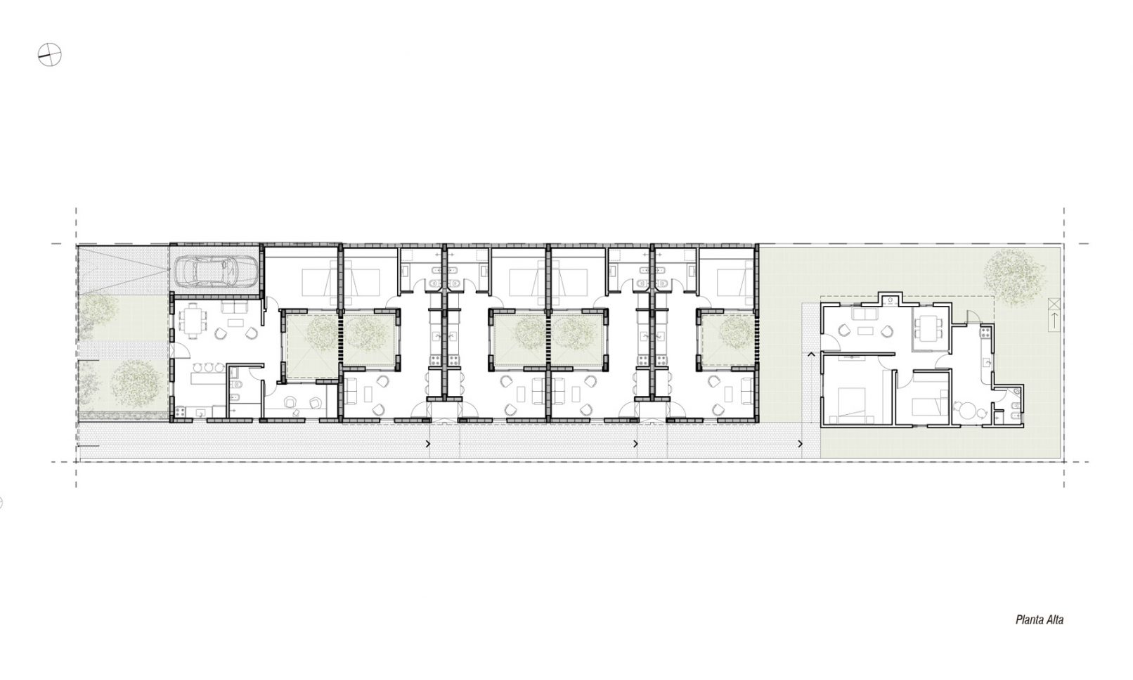 Se proyectan 5 viviendas económicas en propiedad horizontal y se reforma una existente en un predio que tiene 11 m de frente y más de 50 m de profundidad. Las viviendas se diseñan utilizando el bloque como módulo para generar el menor desperdicio posible. Cada tipología cuenta con un patio central que permite por un lado que la casa se viva desde ese lugar y por otro generar buenas condiciones de iluminación y ventilación.