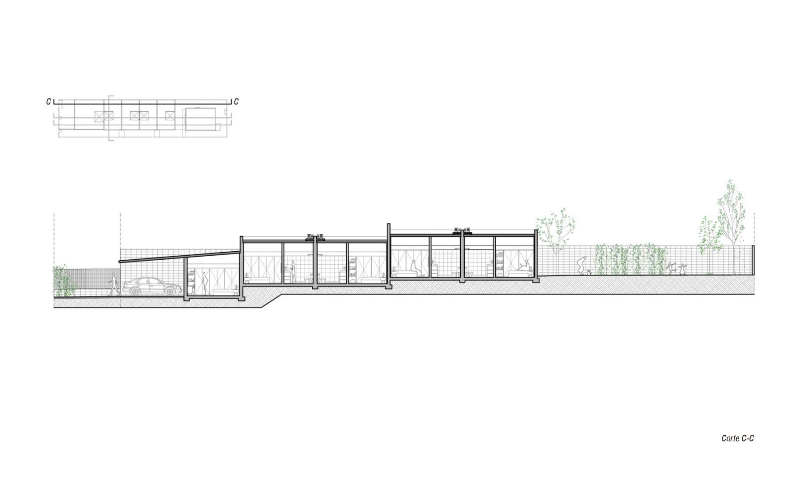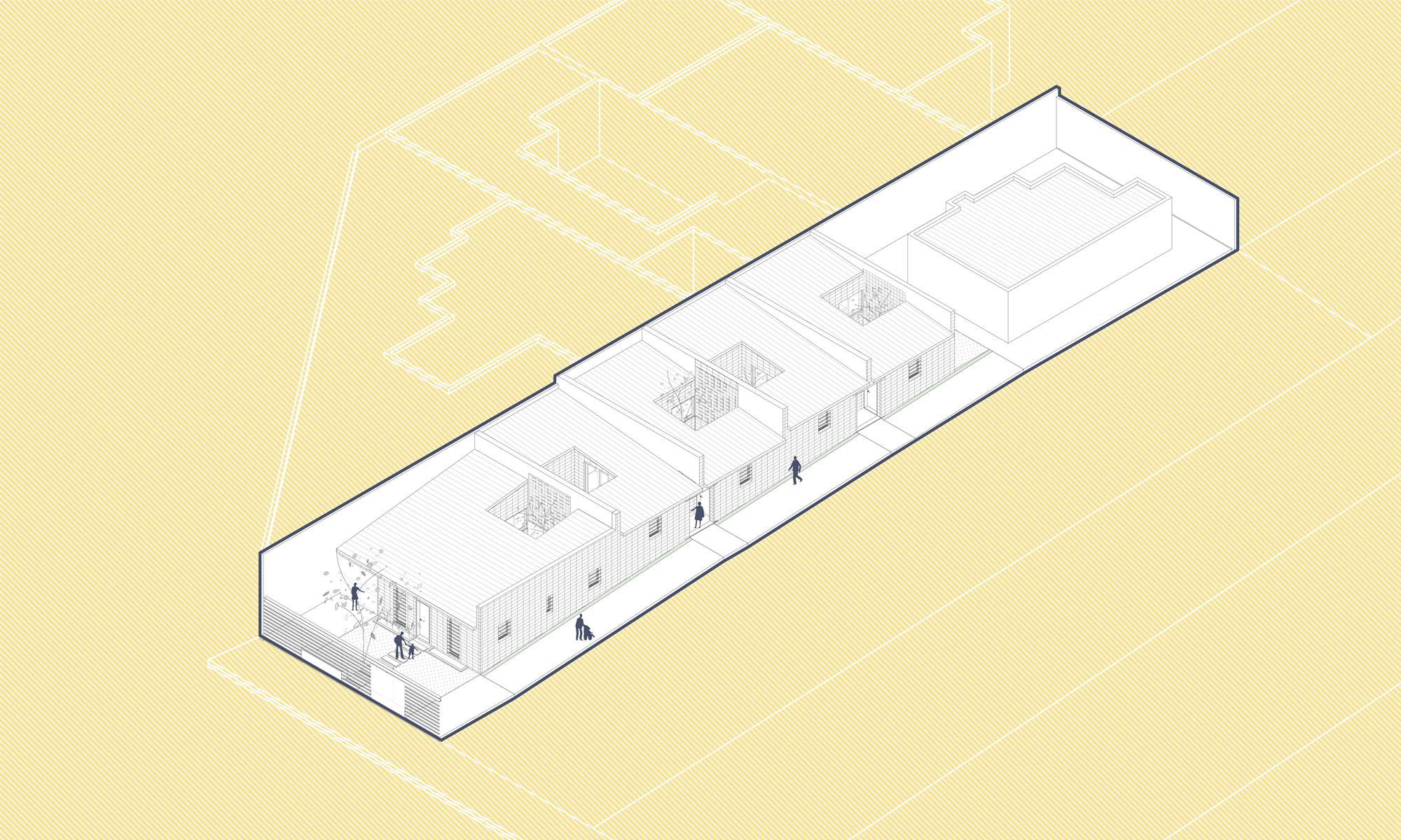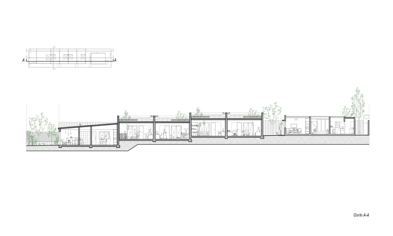 Se proyectan 5 viviendas económicas en propiedad horizontal y se reforma una existente en un predio que tiene 11 m de frente y más de 50 m de profundidad. Las viviendas se diseñan utilizando el bloque como módulo para generar el menor desperdicio posible. Cada tipología cuenta con un patio central que permite por un lado que la casa se viva desde ese lugar y por otro generar buenas condiciones de iluminación y ventilación.
